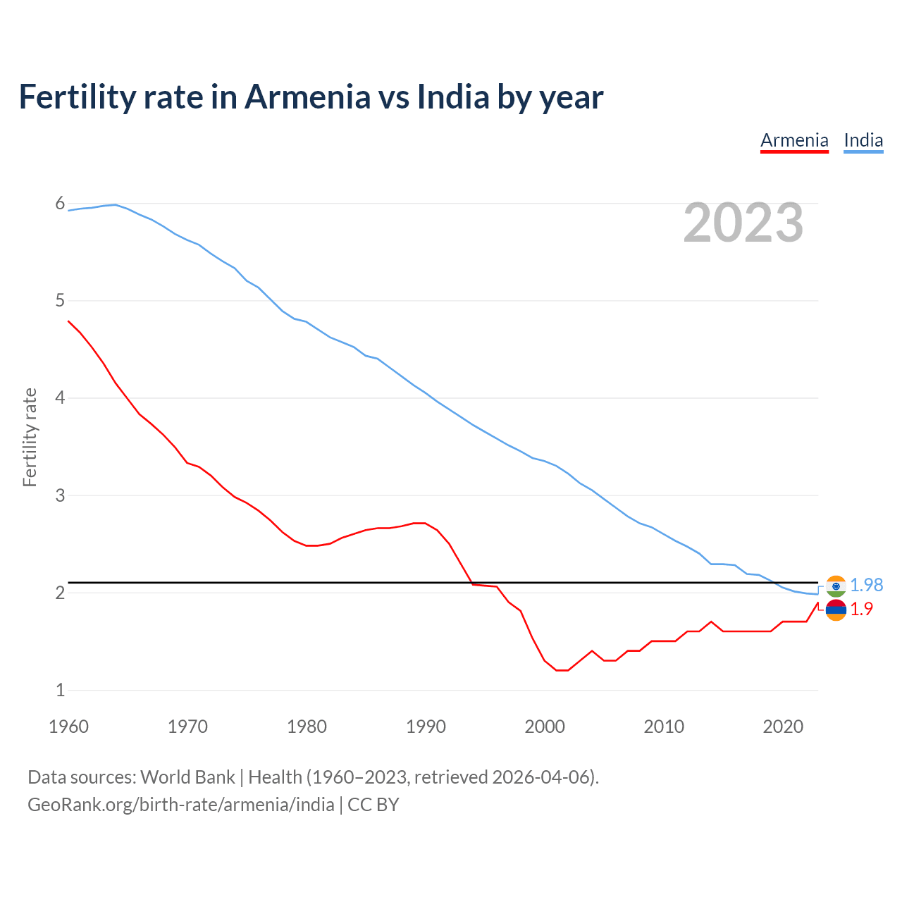 According to the latest available data on birth rates, the fertility rate in Armenia was 1.9 children per woman in 2023, compared to 1.98 in India in 2023. The replacement level is considered to be 2.1 children per woman.