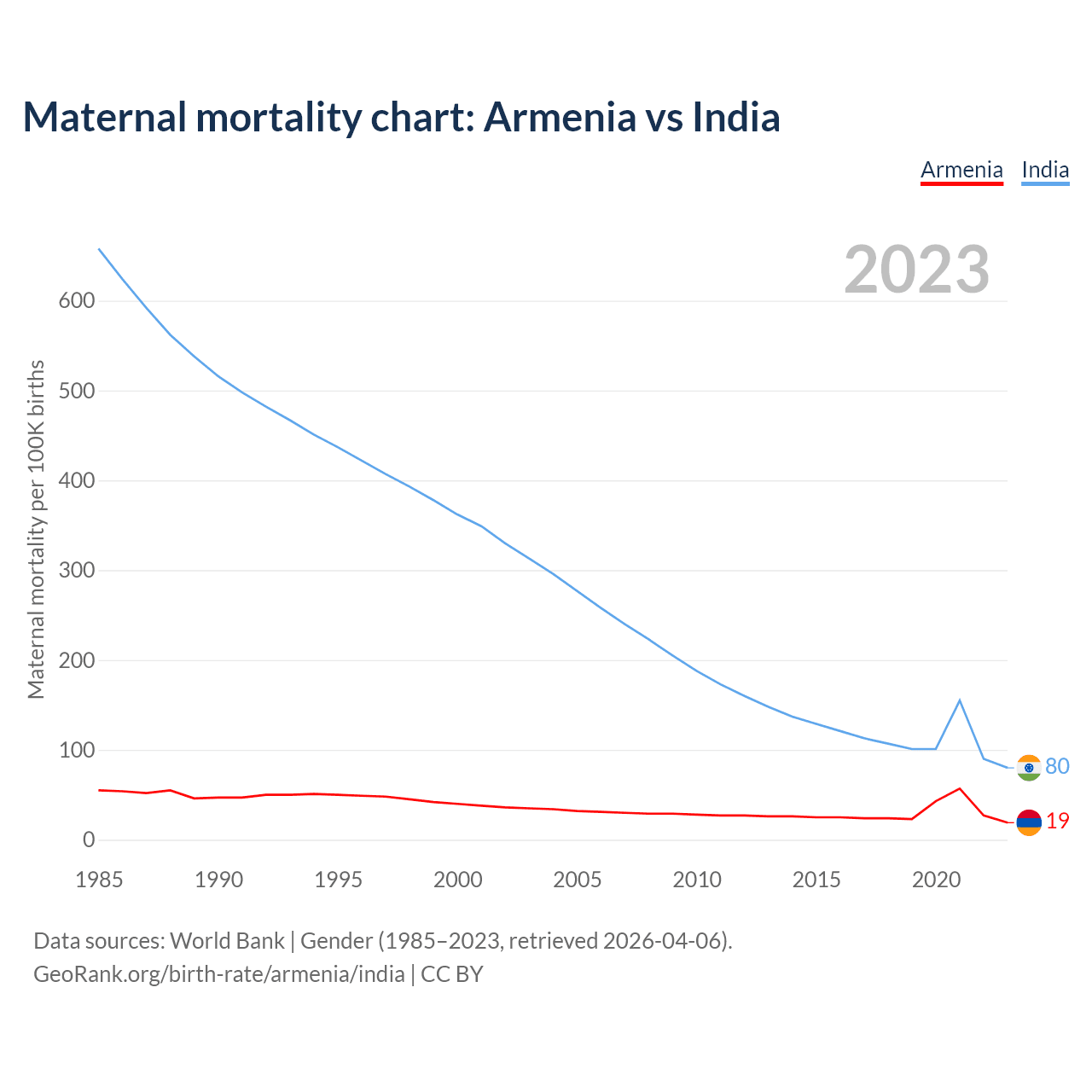 The maternal mortality rate, which is the probability of dying during childbirth or within 42 days of pregnancy termination, is 19 deaths per 100,000 live births in Armenia, compared to 80 deaths in India.