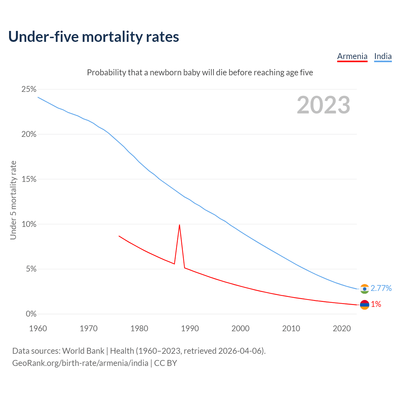 The chance that a newborn baby will die before reaching age five is 1% in Armenia and 2.77% in India. Above is a chart with historical data on under-five mortality rates.