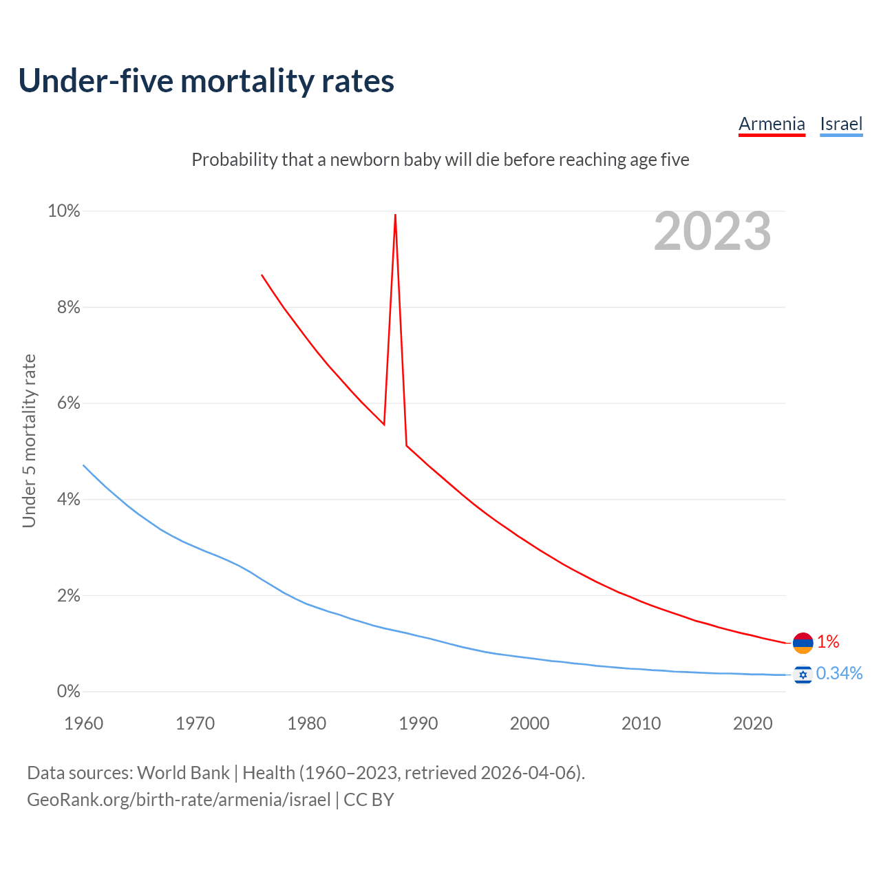 The chance that a newborn baby will die before reaching age five is 1% in Armenia and 0.34% in Israel. Above is a chart with historical data on under-five mortality rates.