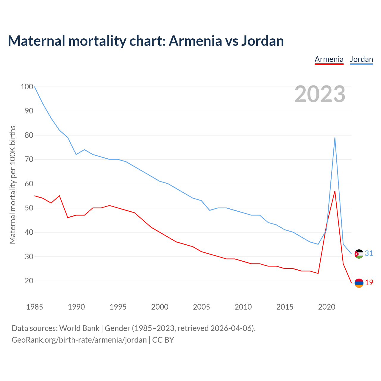 The maternal mortality rate, which is the probability of dying during childbirth or within 42 days of pregnancy termination, is 19 deaths per 100,000 live births in Armenia, compared to 31 deaths in Jordan.