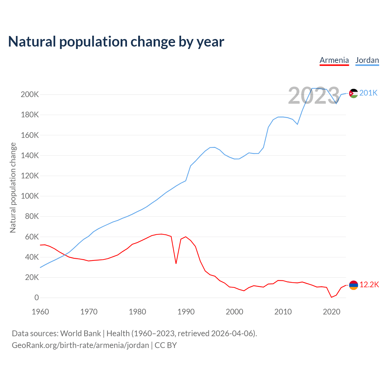 Armenia has an annual birth rate of 12.3 births per 1,000 people, compared to 20.6 for Jordan. The average number of children a woman is expected to have during her lifetime — the fertility rate, is 1.9 in Armenia and 2.64 in Jordan — 38.9% difference.