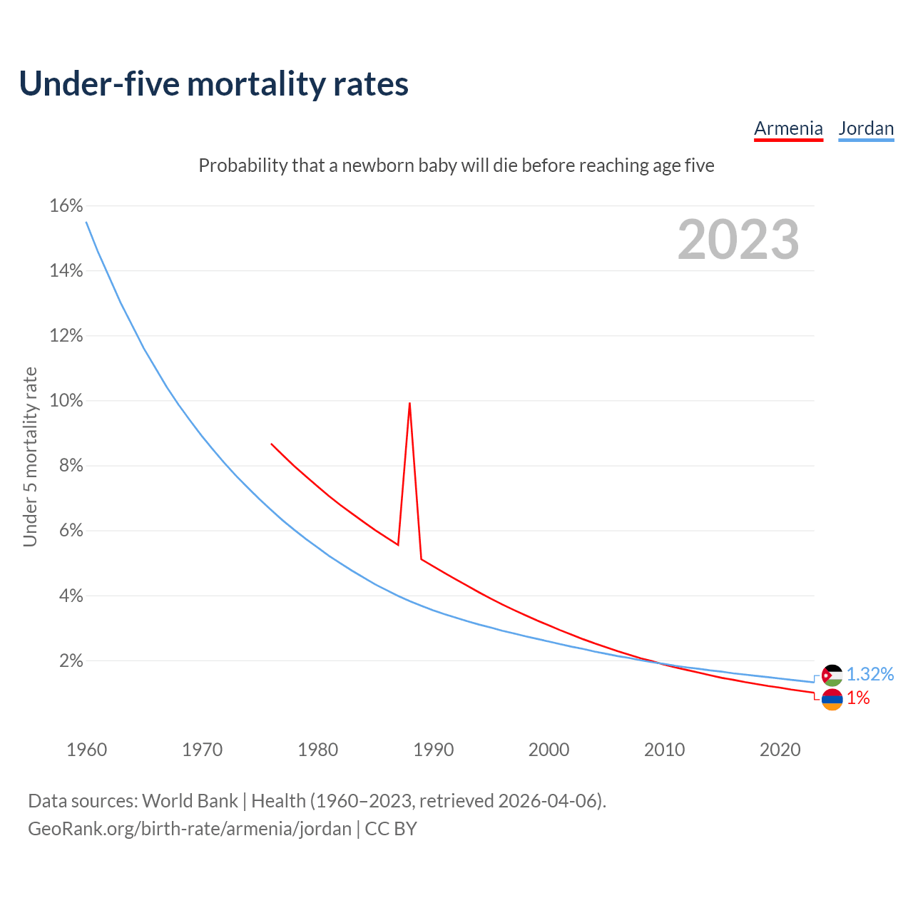 The chance that a newborn baby will die before reaching age five is 1% in Armenia and 1.32% in Jordan. Above is a chart with historical data on under-five mortality rates.