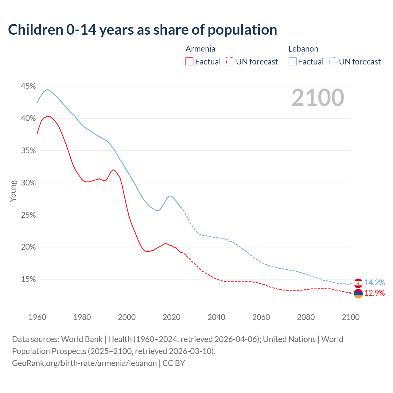 According to the latest available data on birth rates, the fertility rate in Armenia was 1.9 children per woman in 2023, compared to 2.24 in Lebanon in 2023. The replacement level is considered to be 2.1 children per woman.