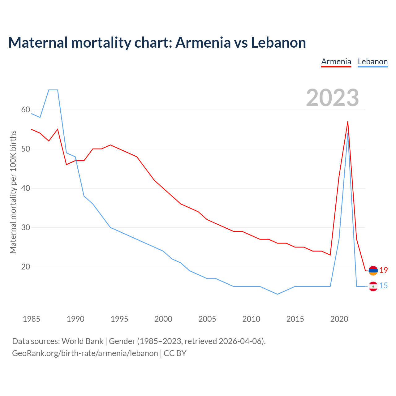 The maternal mortality rate, which is the probability of dying during childbirth or within 42 days of pregnancy termination, is 19 deaths per 100,000 live births in Armenia, compared to 15 deaths in Lebanon.