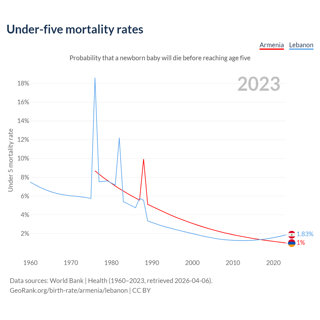 The chance that a newborn baby will die before reaching age five is 1% in Armenia and 1.83% in Lebanon. Above is a chart with historical data on under-five mortality rates.