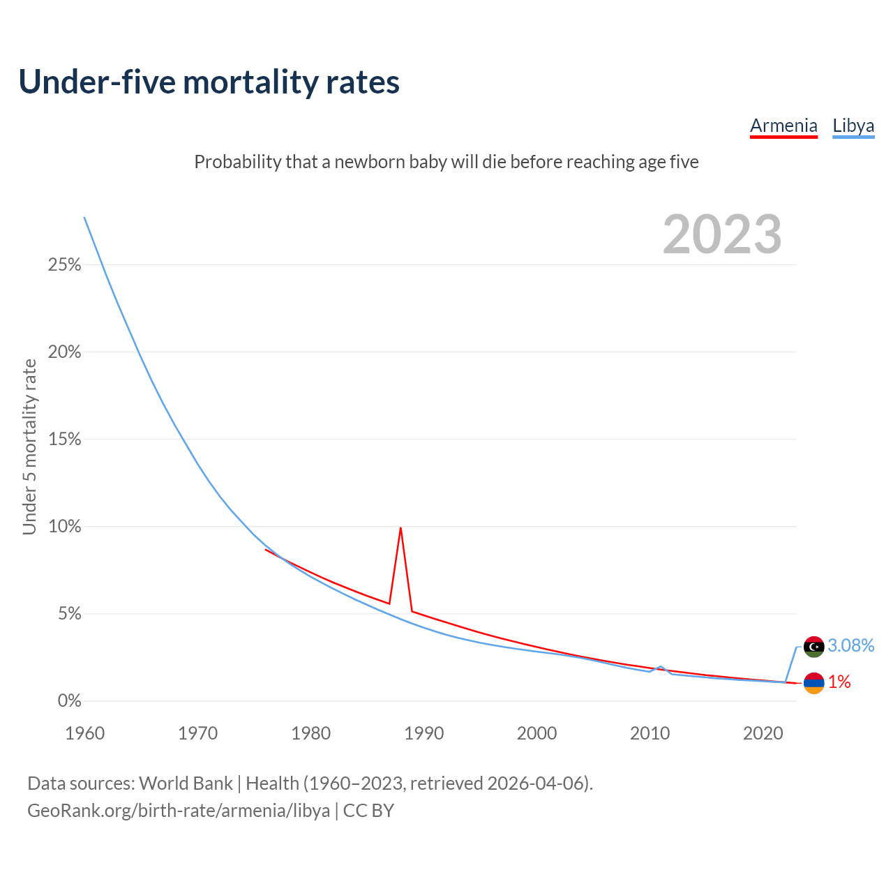 The chance that a newborn baby will die before reaching age five is 1% in Armenia and 3.08% in Libya. Above is a chart with historical data on under-five mortality rates.