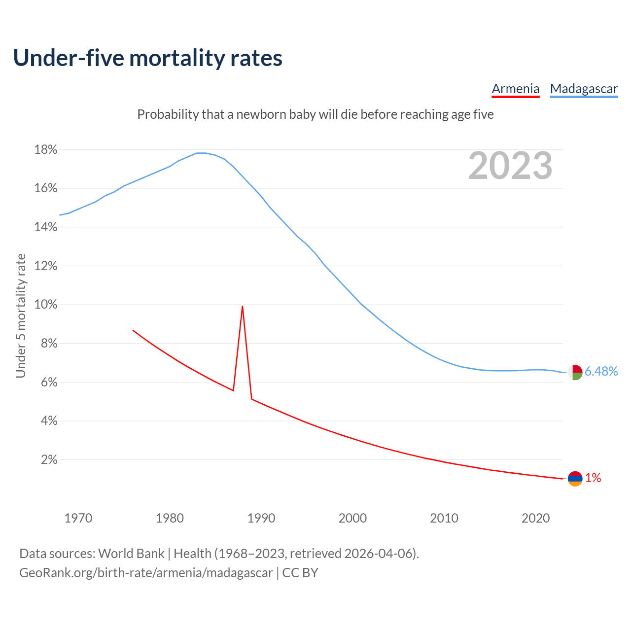 The chance that a newborn baby will die before reaching age five is 1% in Armenia and 6.48% in Madagascar. Above is a chart with historical data on under-five mortality rates.