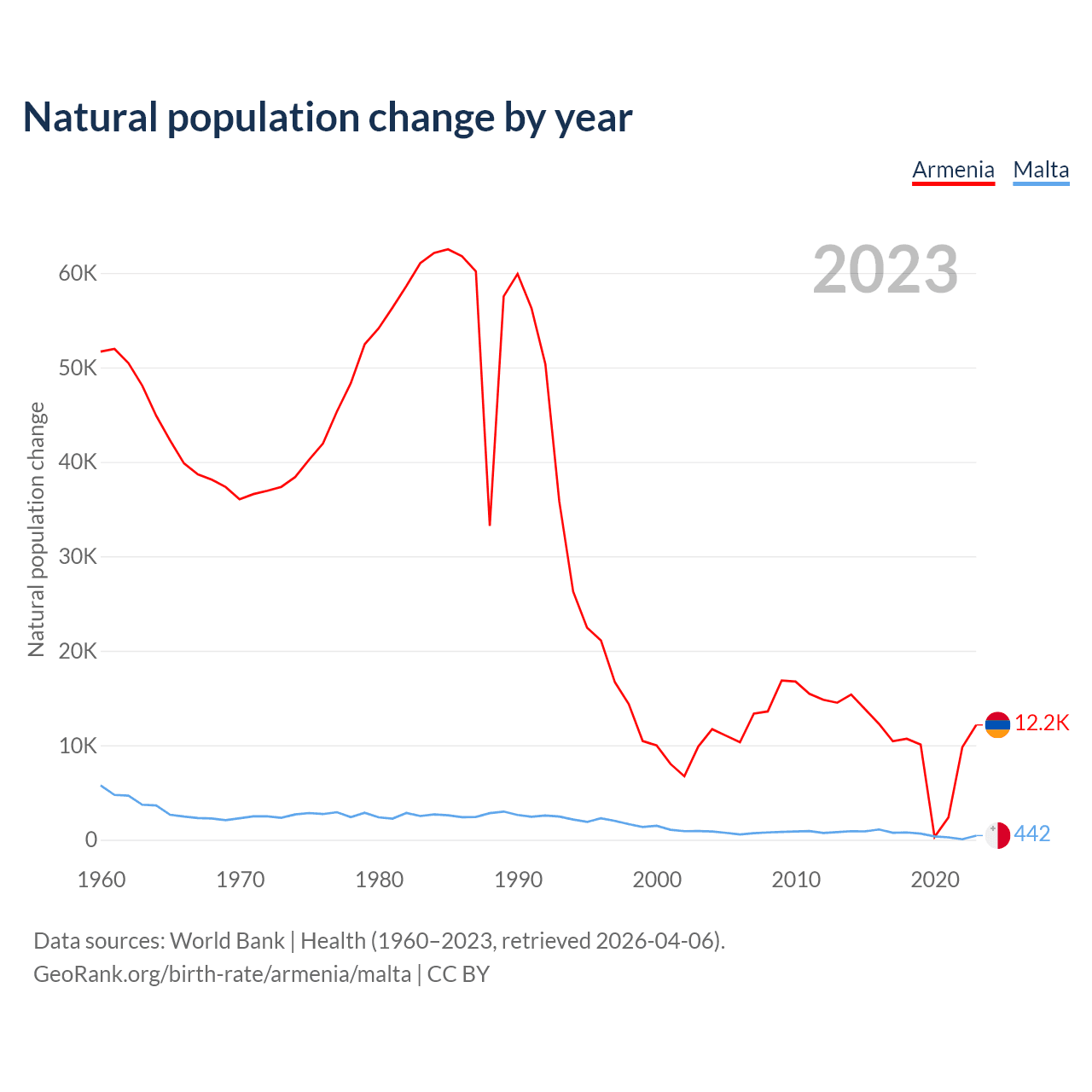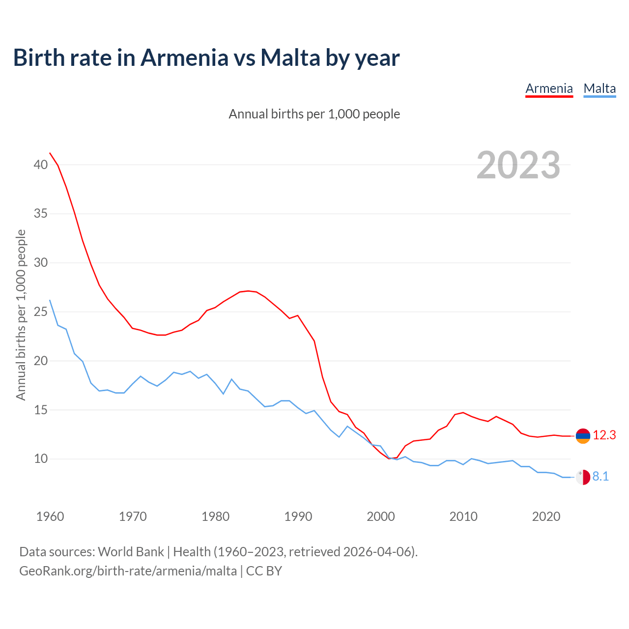 According to the latest available data on birth rates, the fertility rate in Armenia was 1.9 children per woman in 2023, compared to 1.06 in Malta in 2023. The replacement level is considered to be 2.1 children per woman.