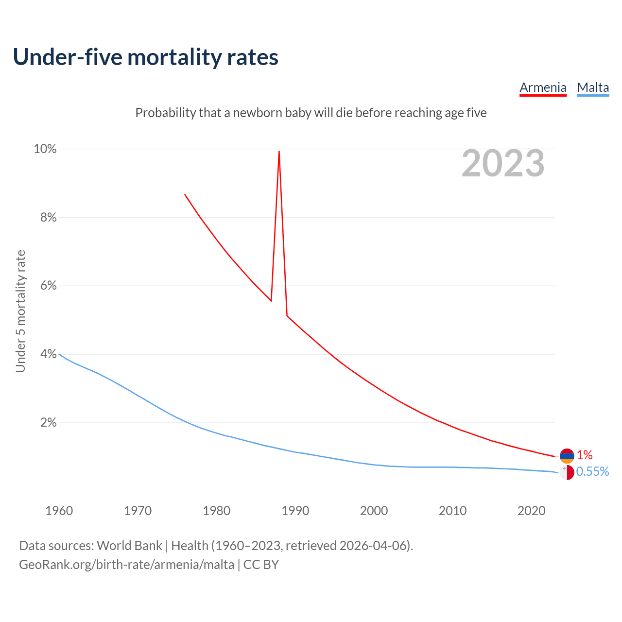 The chance that a newborn baby will die before reaching age five is 1% in Armenia and 0.55% in Malta. Above is a chart with historical data on under-five mortality rates.