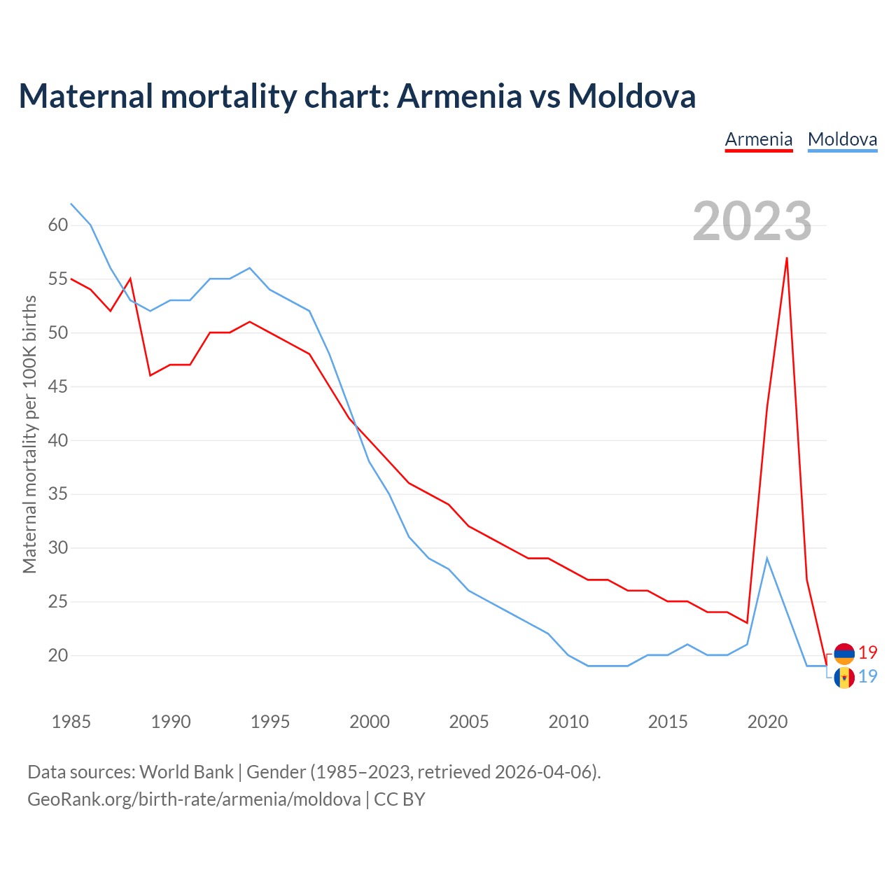 The maternal mortality rate, which is the probability of dying during childbirth or within 42 days of pregnancy termination, is 19 deaths per 100,000 live births in Armenia, compared to 19 deaths in Moldova.