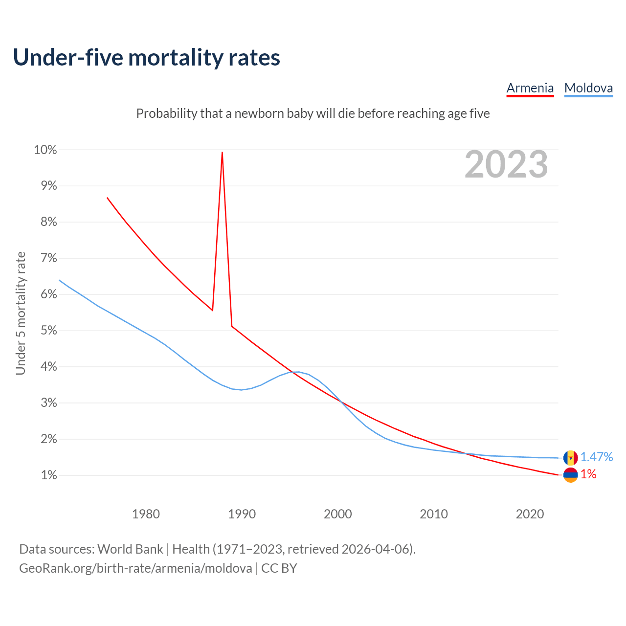The chance that a newborn baby will die before reaching age five is 1% in Armenia and 1.47% in Moldova. Above is a chart with historical data on under-five mortality rates.