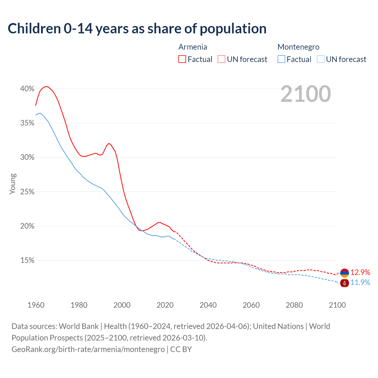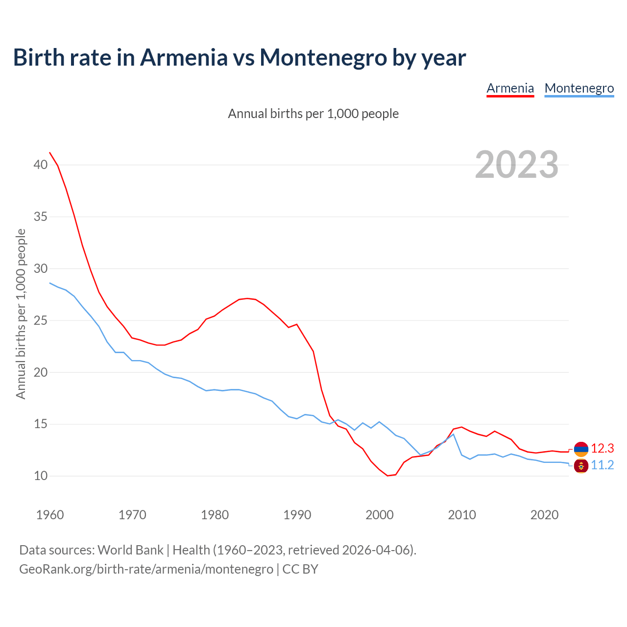 According to the latest available data on birth rates, the fertility rate in Armenia was 1.9 children per woman in 2023, compared to 1.74 in Montenegro in 2023. The replacement level is considered to be 2.1 children per woman.
