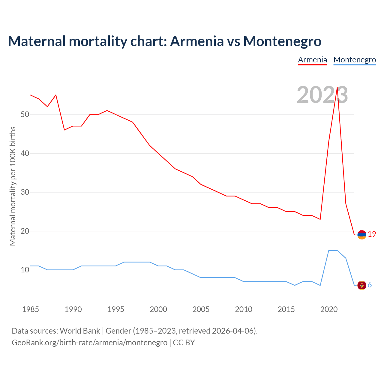 The maternal mortality rate, which is the probability of dying during childbirth or within 42 days of pregnancy termination, is 19 deaths per 100,000 live births in Armenia, compared to 6 deaths in Montenegro.