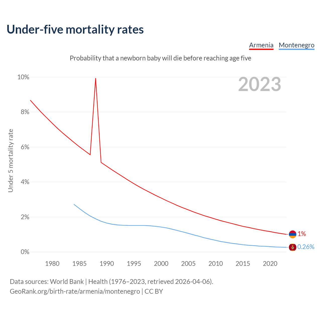 The chance that a newborn baby will die before reaching age five is 1% in Armenia and 0.26% in Montenegro. Above is a chart with historical data on under-five mortality rates.