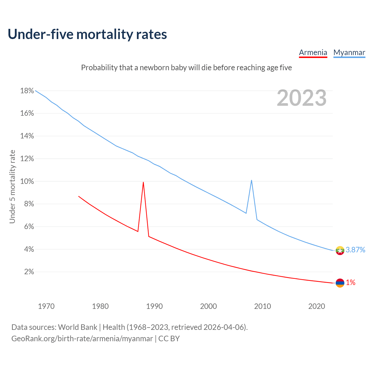 The chance that a newborn baby will die before reaching age five is 1% in Armenia and 3.87% in Myanmar. Above is a chart with historical data on under-five mortality rates.