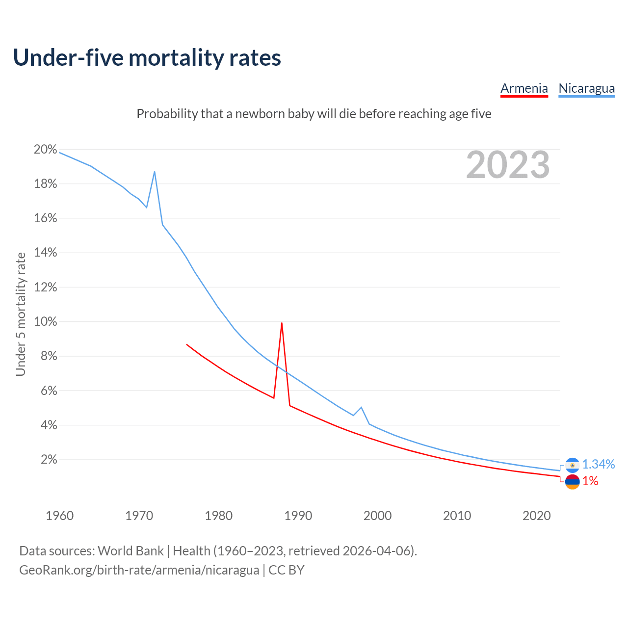The chance that a newborn baby will die before reaching age five is 1% in Armenia and 1.34% in Nicaragua. Above is a chart with historical data on under-five mortality rates.