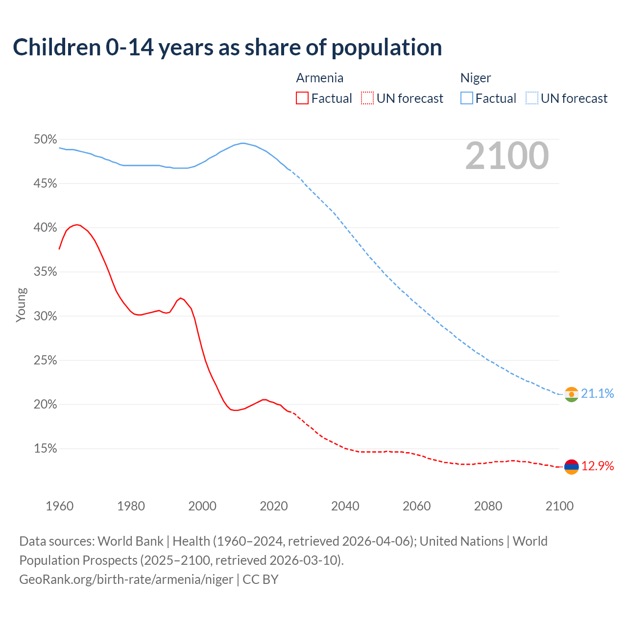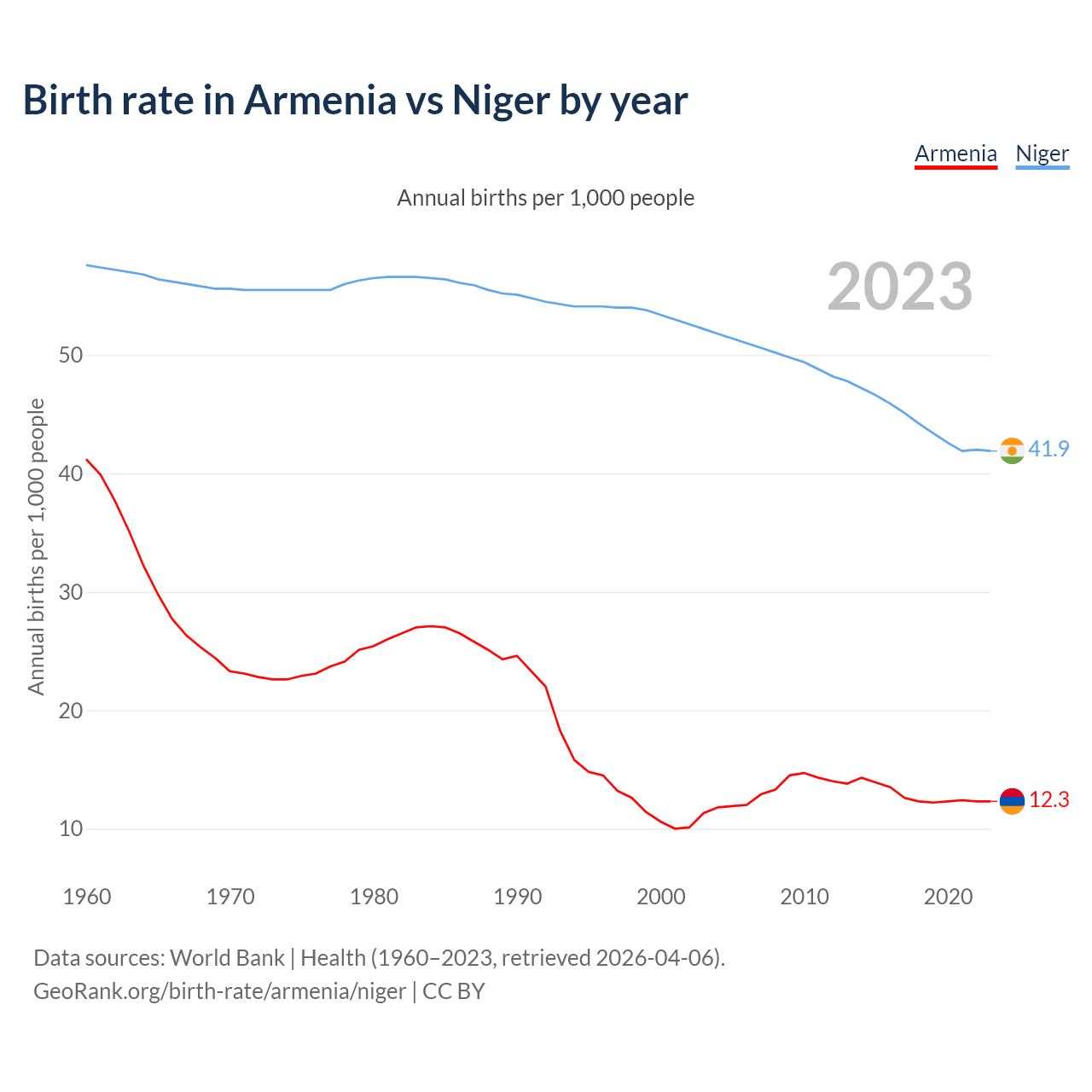 Armenia has an annual birth rate of 12.3 births per 1,000 people, compared to 41.9 for Niger. The average number of children a woman is expected to have during her lifetime — the fertility rate, is 1.9 in Armenia and 6.06 in Niger — 219% difference.