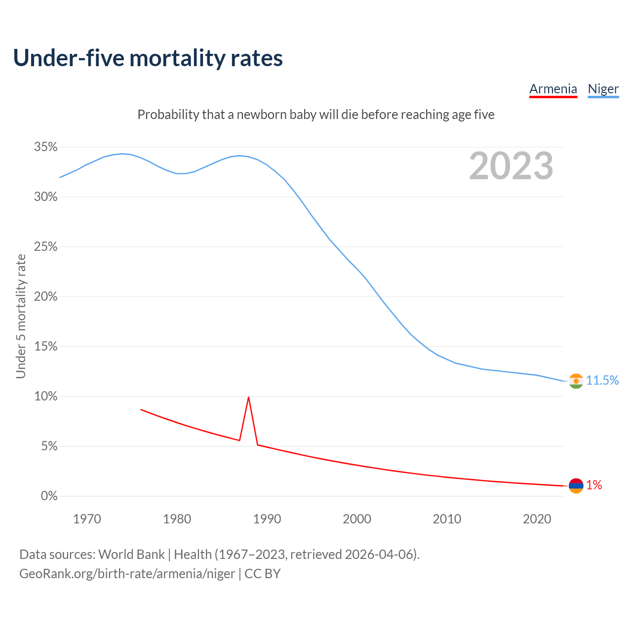 The chance that a newborn baby will die before reaching age five is 1% in Armenia and 11.5% in Niger. Above is a chart with historical data on under-five mortality rates.