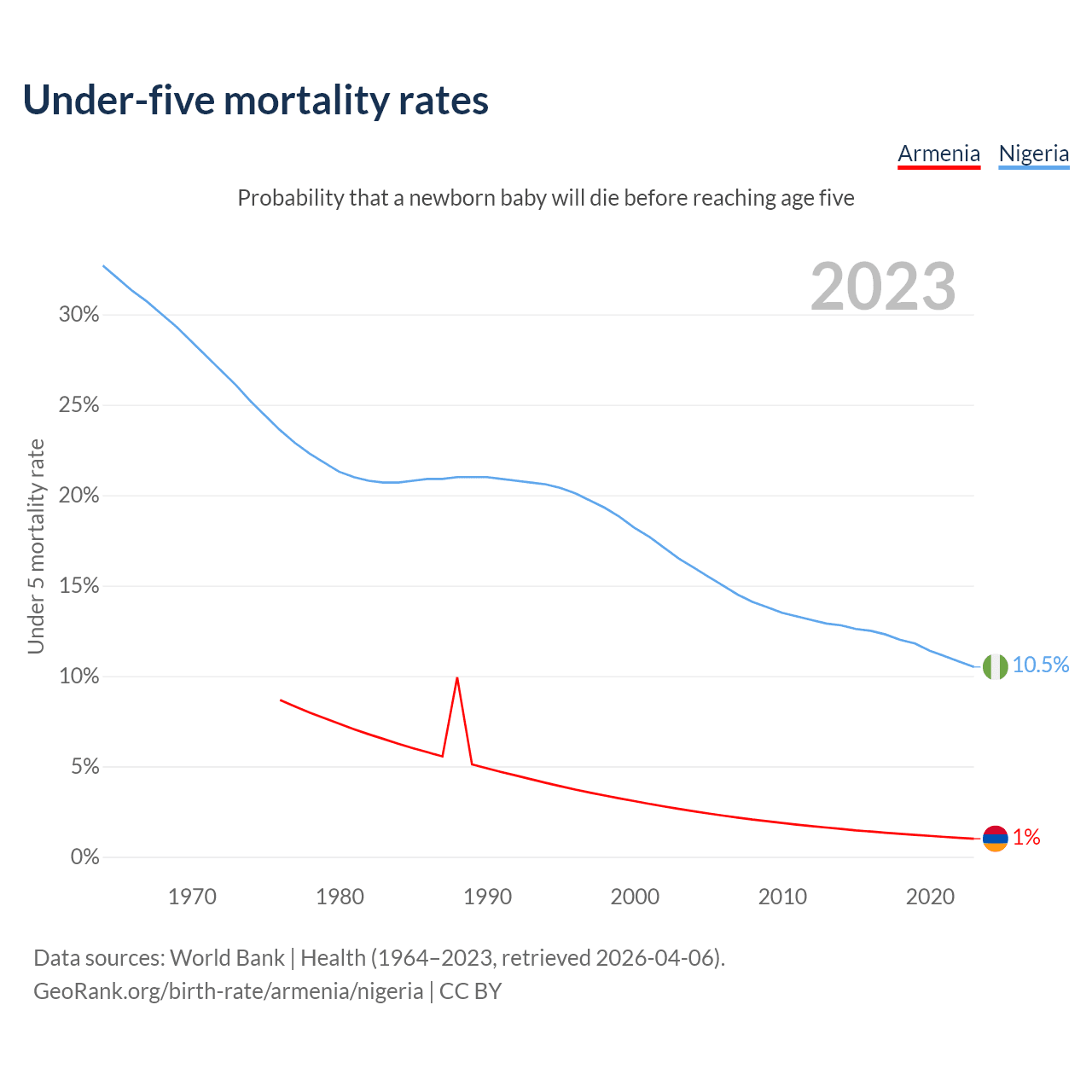 The chance that a newborn baby will die before reaching age five is 1% in Armenia and 10.5% in Nigeria. Above is a chart with historical data on under-five mortality rates.