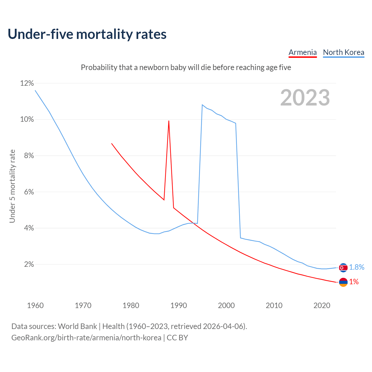 The chance that a newborn baby will die before reaching age five is 1% in Armenia and 1.8% in North Korea. Above is a chart with historical data on under-five mortality rates.
