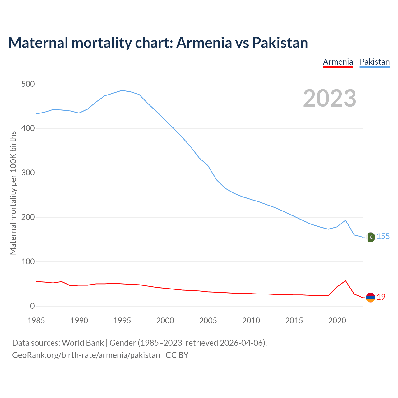 The maternal mortality rate, which is the probability of dying during childbirth or within 42 days of pregnancy termination, is 19 deaths per 100,000 live births in Armenia, compared to 155 deaths in Pakistan.