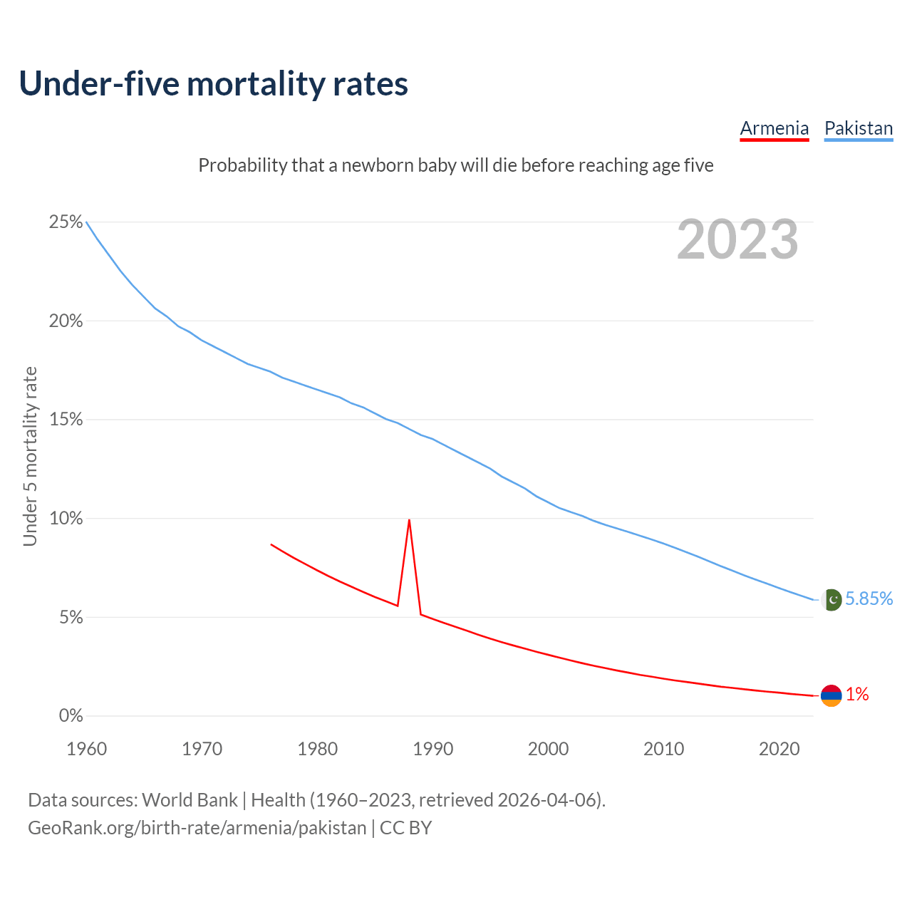 The chance that a newborn baby will die before reaching age five is 1% in Armenia and 5.85% in Pakistan. Above is a chart with historical data on under-five mortality rates.