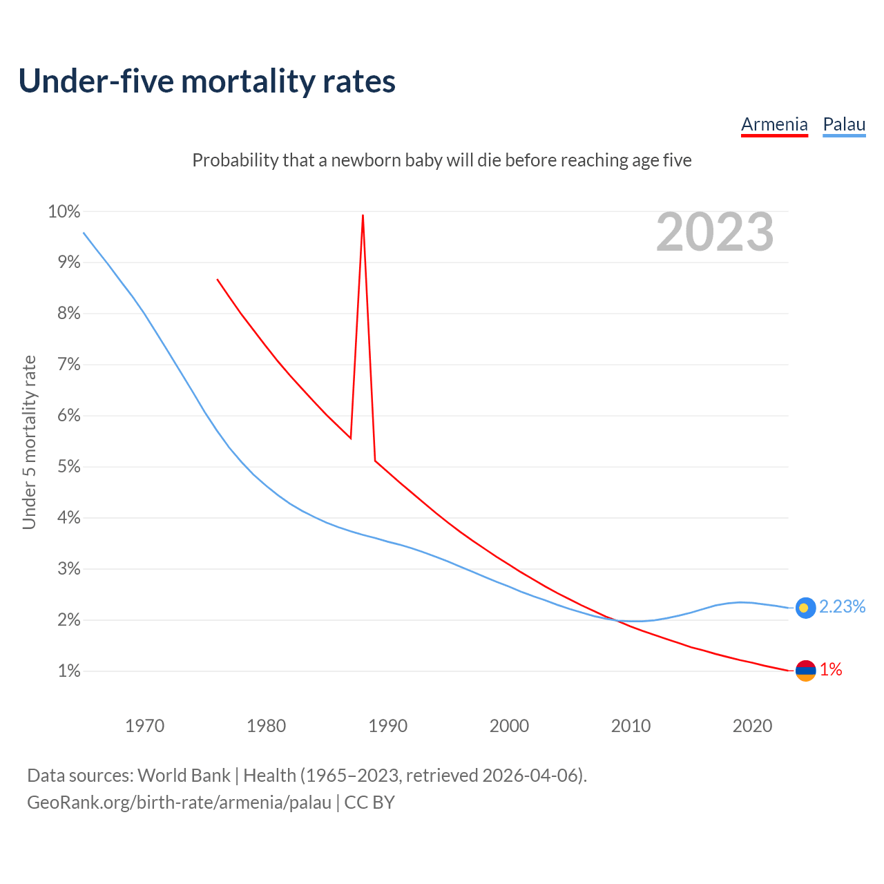 The chance that a newborn baby will die before reaching age five is 1% in Armenia and 2.23% in Palau. Above is a chart with historical data on under-five mortality rates.