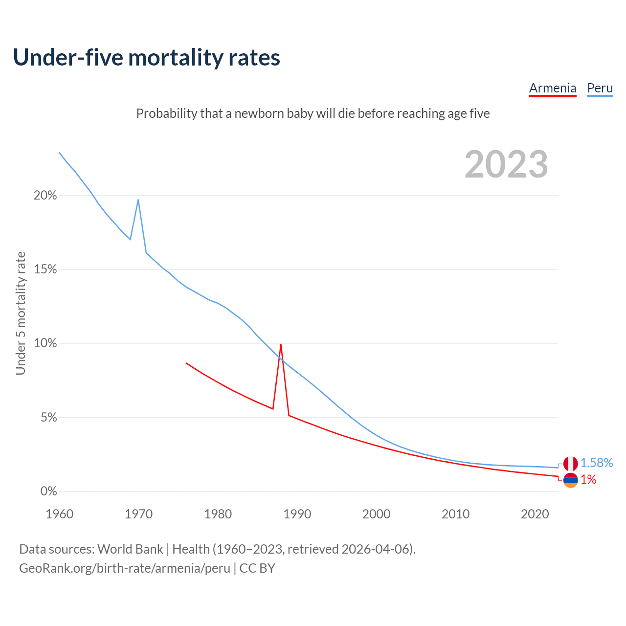 The chance that a newborn baby will die before reaching age five is 1% in Armenia and 1.58% in Peru. Above is a chart with historical data on under-five mortality rates.