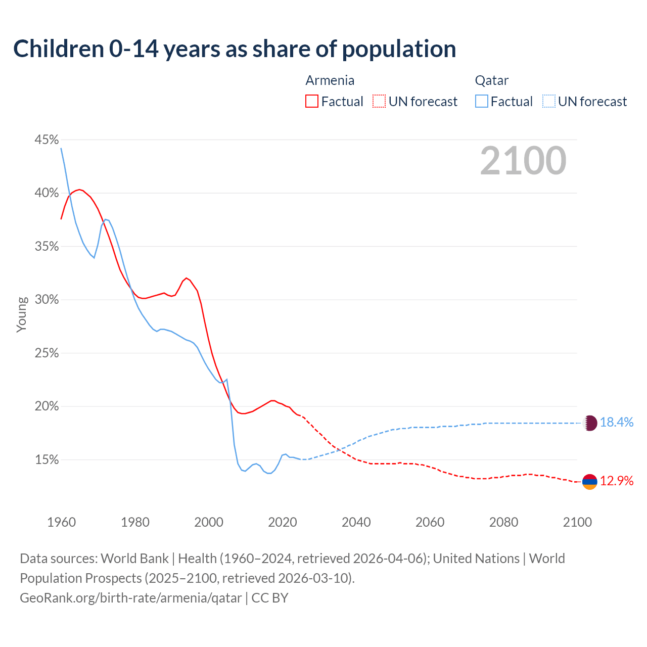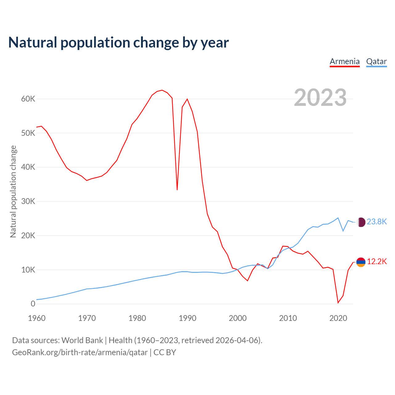 Armenia has an annual birth rate of 12.3 births per 1,000 people, compared to 9.91 for Qatar. The average number of children a woman is expected to have during her lifetime — the fertility rate, is 1.9 in Armenia and 1.73 in Qatar — 9% difference.