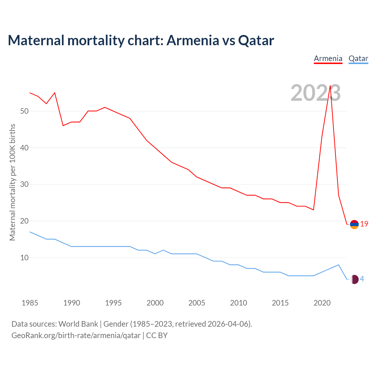 The maternal mortality rate, which is the probability of dying during childbirth or within 42 days of pregnancy termination, is 19 deaths per 100,000 live births in Armenia, compared to 4 deaths in Qatar.
