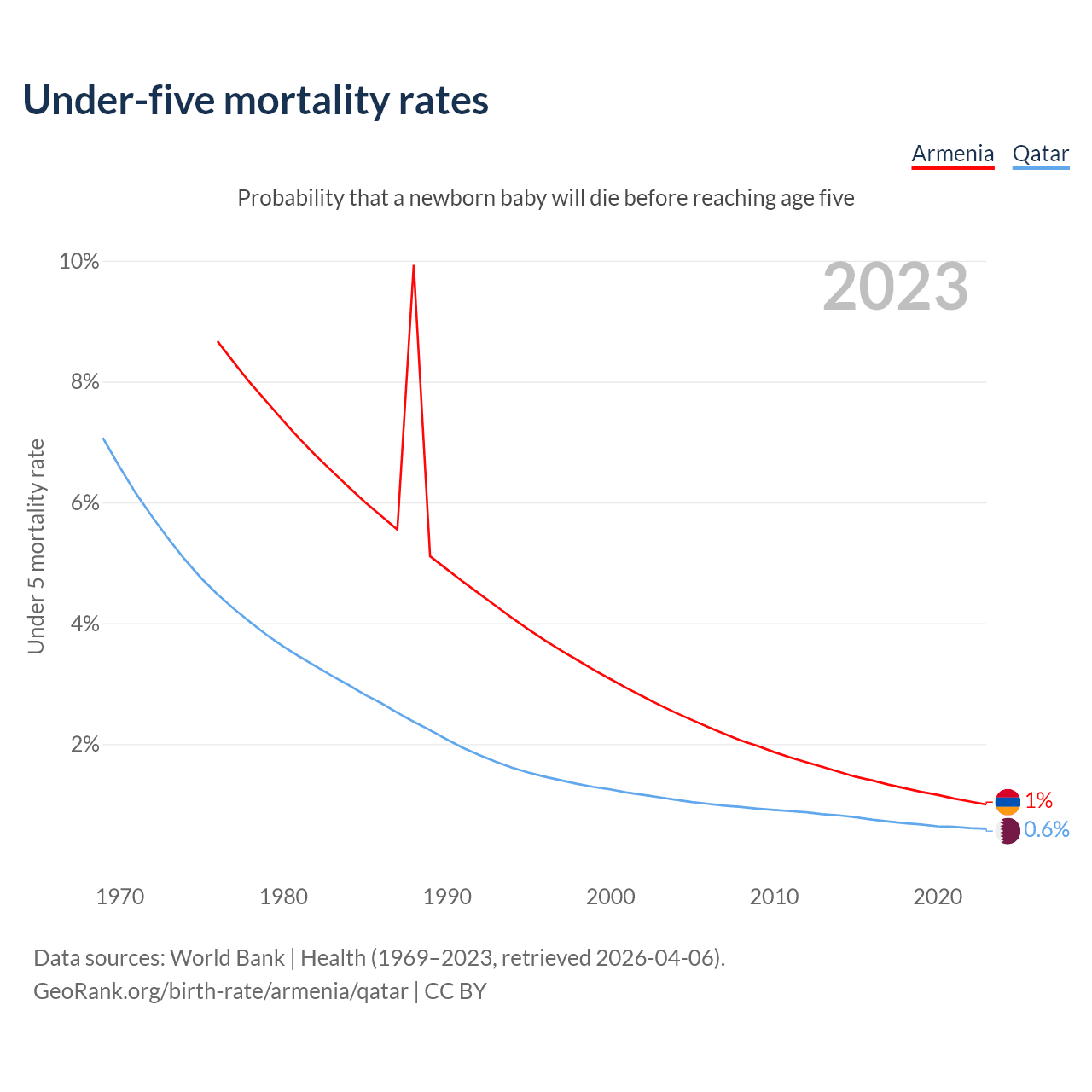 The chance that a newborn baby will die before reaching age five is 1% in Armenia and 0.6% in Qatar. Above is a chart with historical data on under-five mortality rates.
