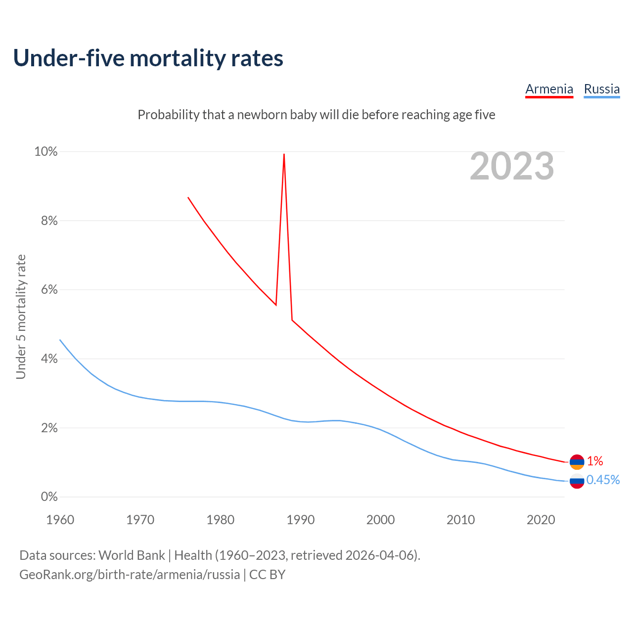 The chance that a newborn baby will die before reaching age five is 1% in Armenia and 0.45% in Russia. Above is a chart with historical data on under-five mortality rates.
