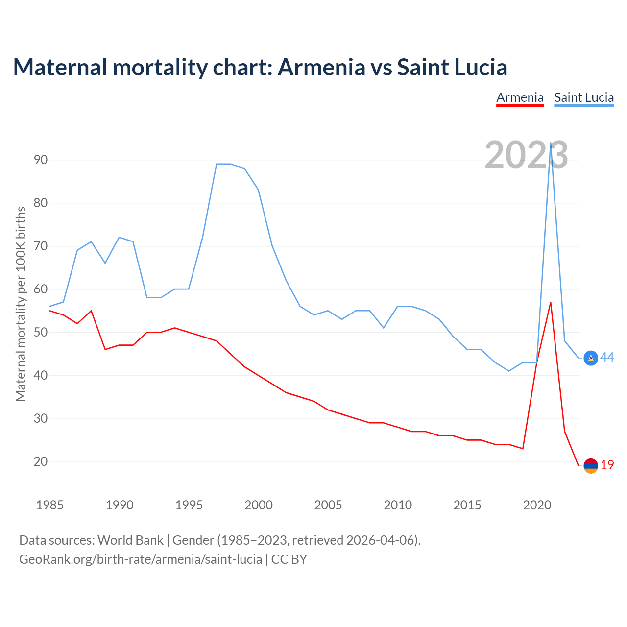 The maternal mortality rate, which is the probability of dying during childbirth or within 42 days of pregnancy termination, is 19 deaths per 100,000 live births in Armenia, compared to 44 deaths in Saint Lucia.