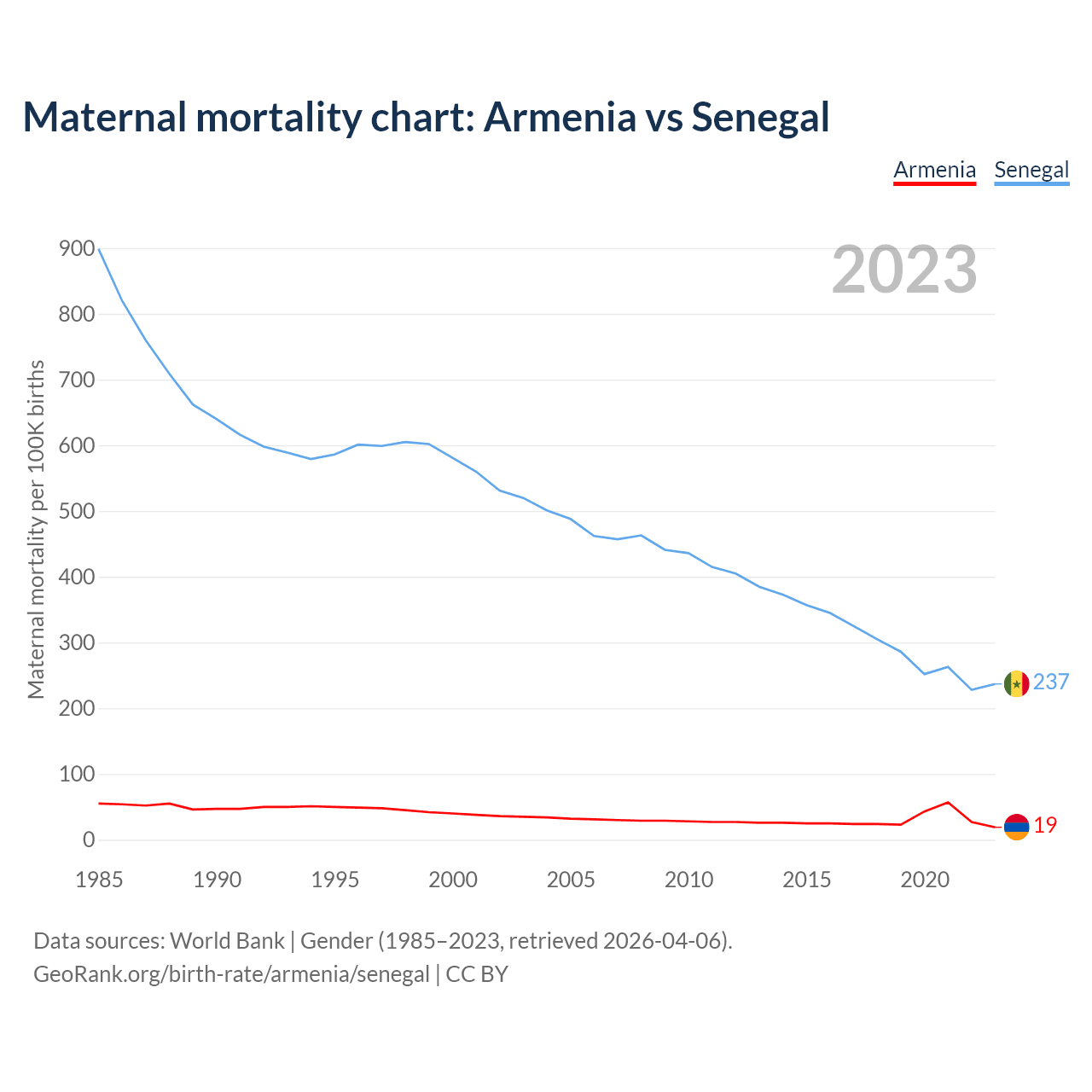 The maternal mortality rate, which is the probability of dying during childbirth or within 42 days of pregnancy termination, is 19 deaths per 100,000 live births in Armenia, compared to 237 deaths in Senegal.