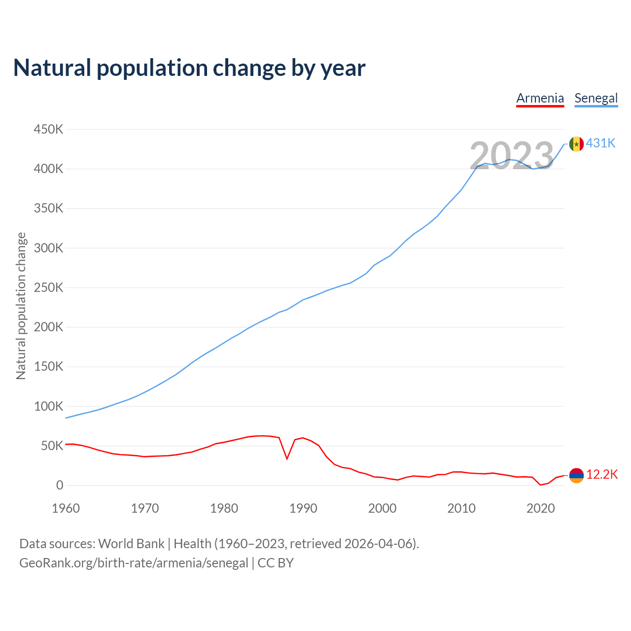 According to the latest available data on birth rates, the fertility rate in Armenia was 1.9 children per woman in 2023, compared to 3.82 in Senegal in 2023. The replacement level is considered to be 2.1 children per woman.