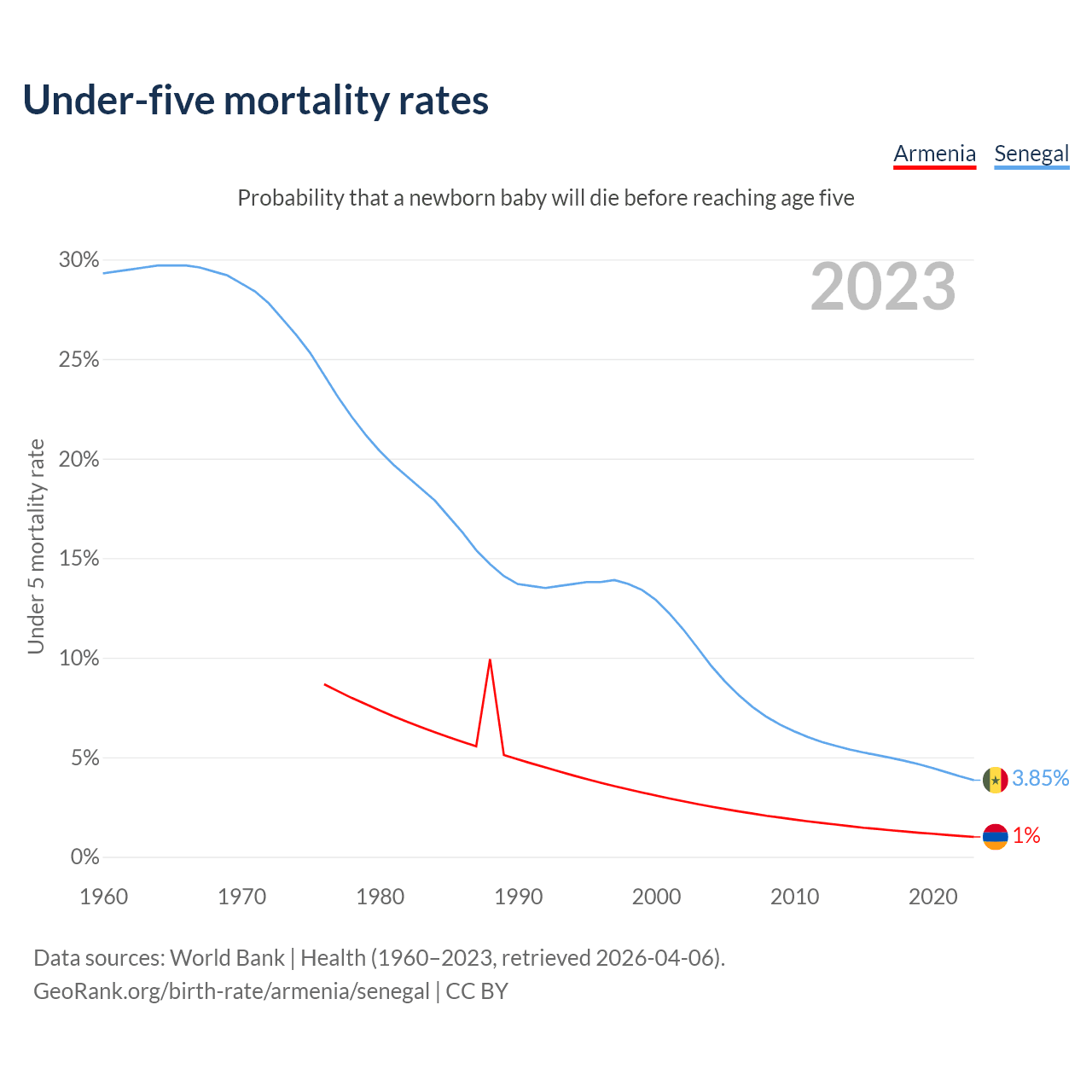 The chance that a newborn baby will die before reaching age five is 1% in Armenia and 3.85% in Senegal. Above is a chart with historical data on under-five mortality rates.