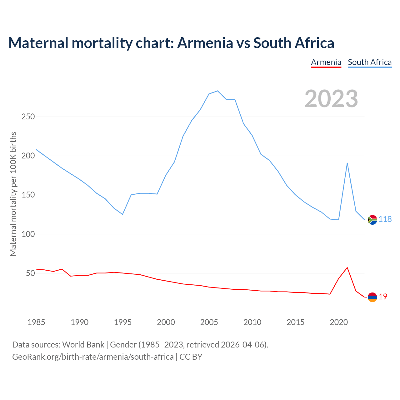 The maternal mortality rate, which is the probability of dying during childbirth or within 42 days of pregnancy termination, is 19 deaths per 100,000 live births in Armenia, compared to 118 deaths in South Africa.