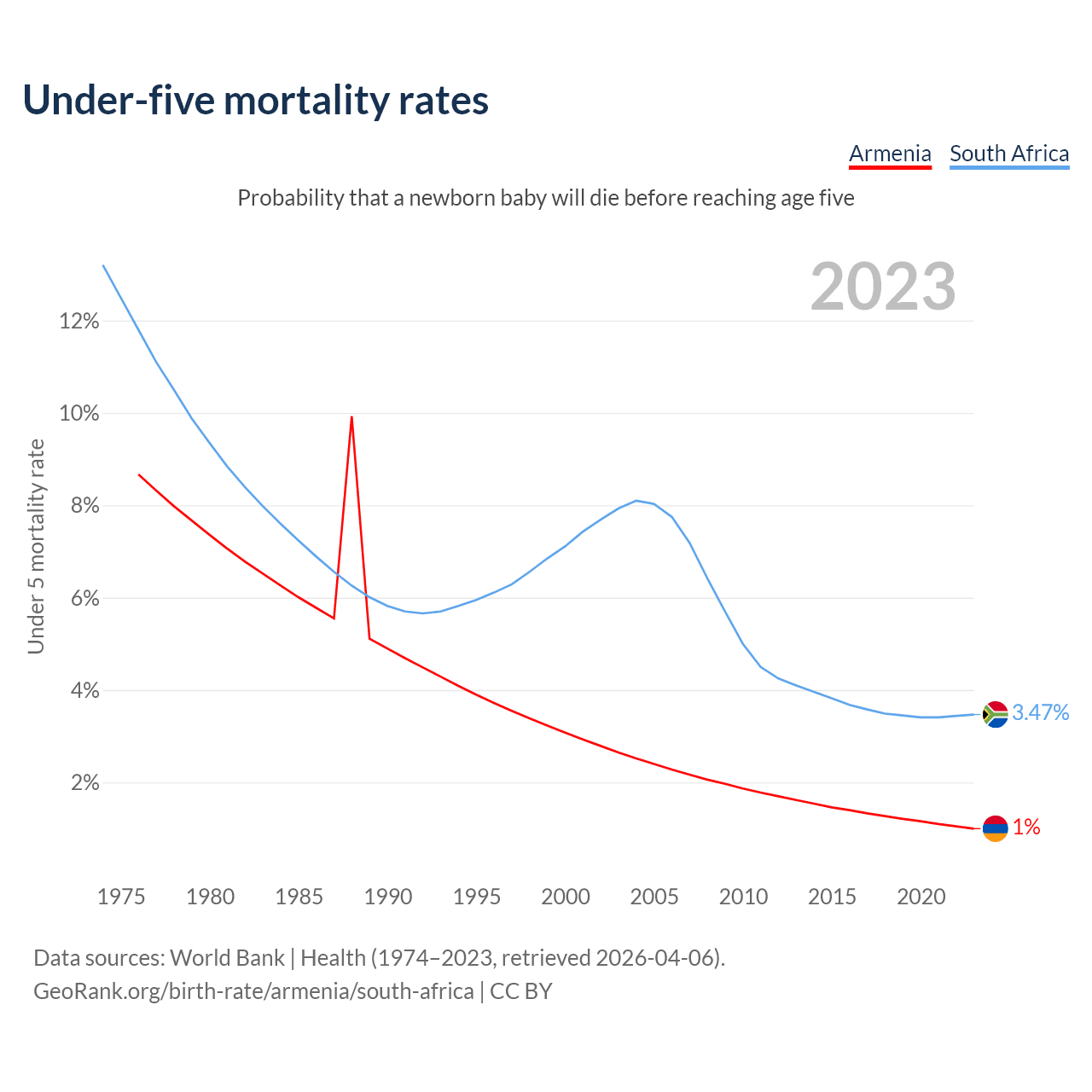 The chance that a newborn baby will die before reaching age five is 1% in Armenia and 3.47% in South Africa. Above is a chart with historical data on under-five mortality rates.