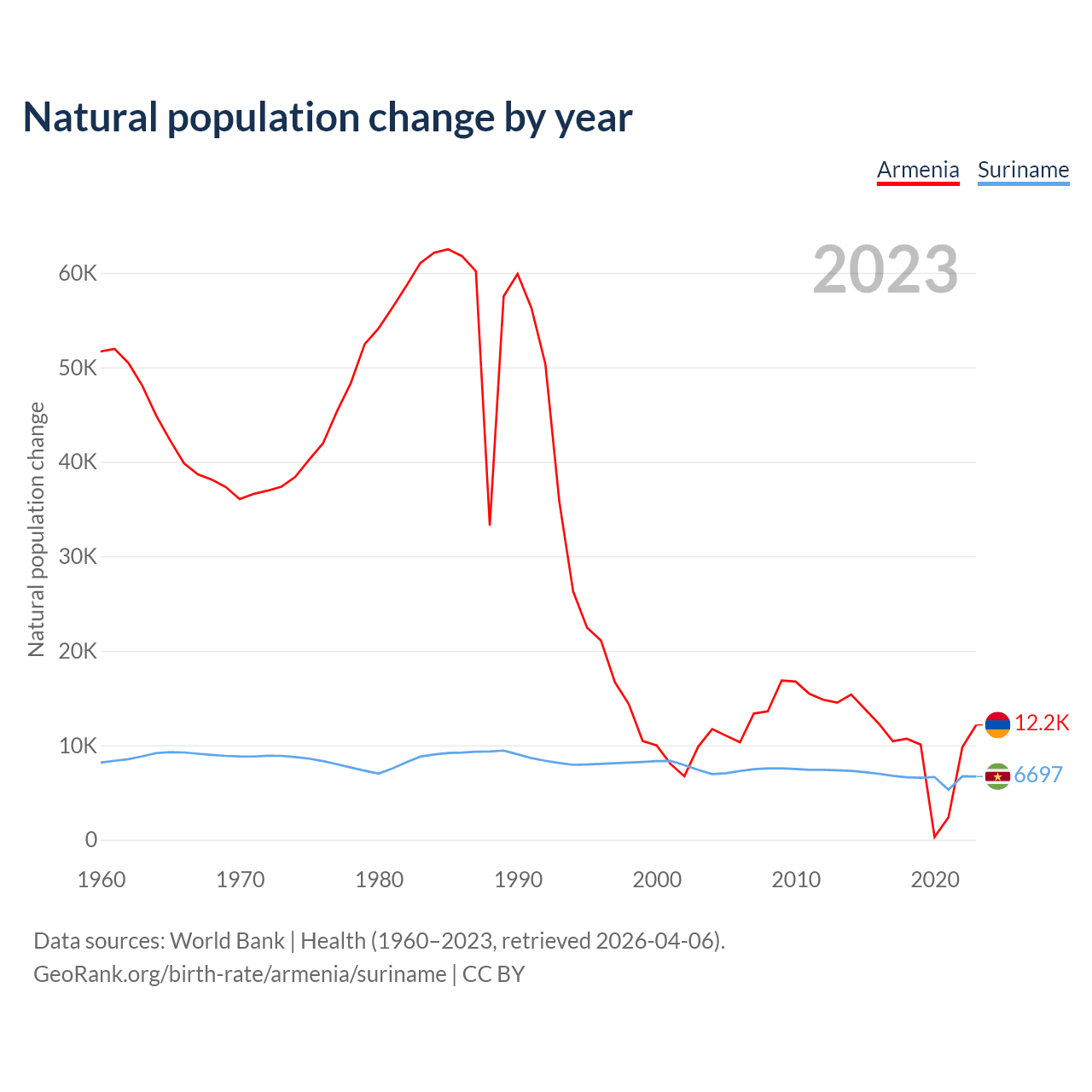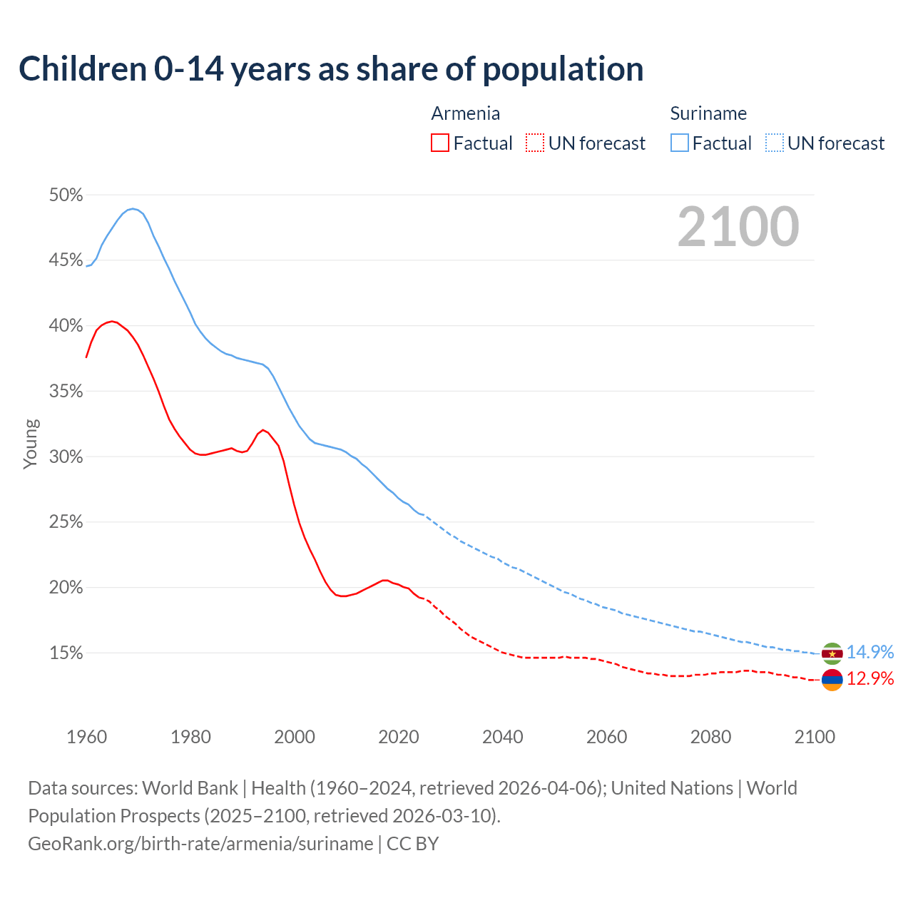 According to the latest available data on birth rates, the fertility rate in Armenia was 1.9 children per woman in 2023, compared to 2.25 in Suriname in 2023. The replacement level is considered to be 2.1 children per woman.