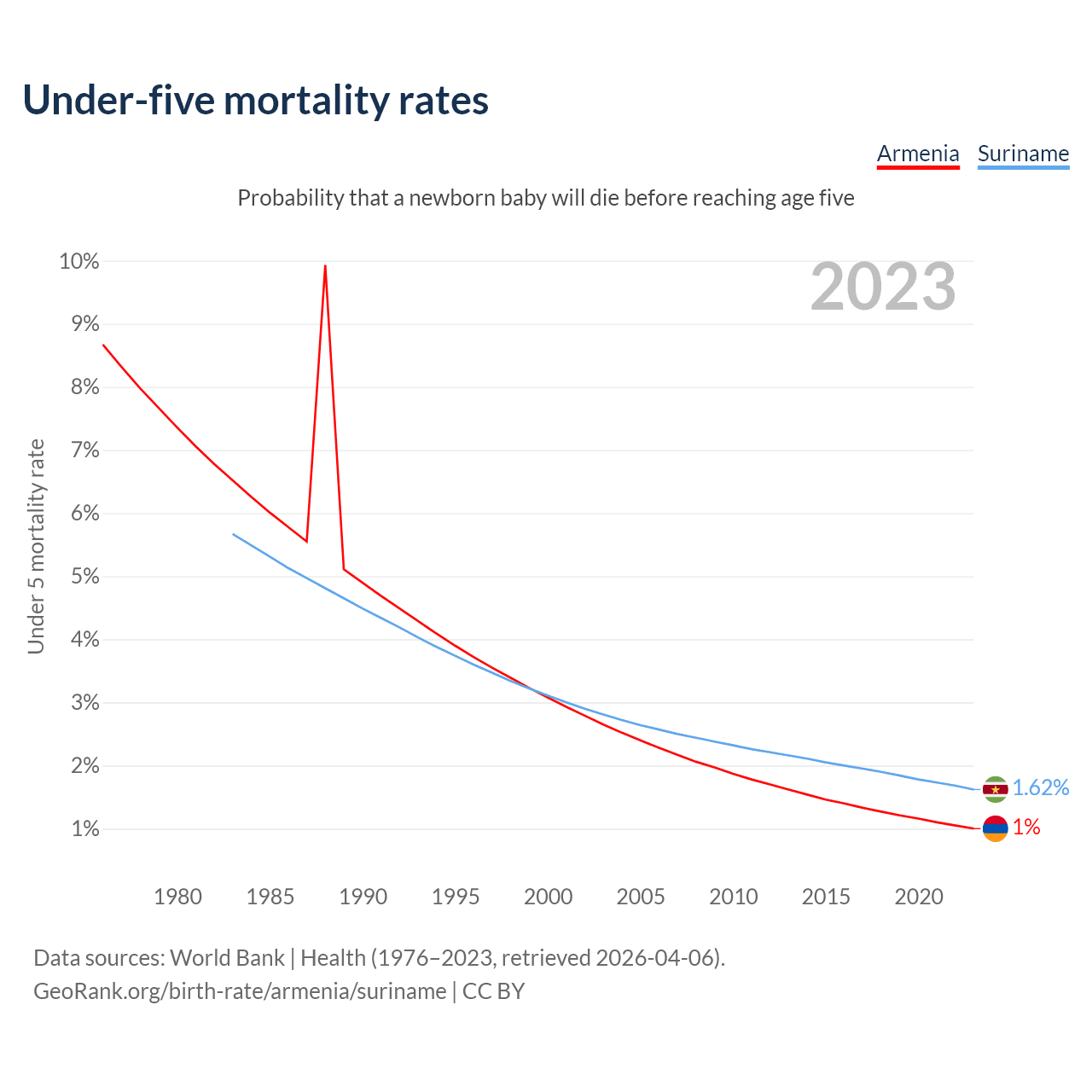 The chance that a newborn baby will die before reaching age five is 1% in Armenia and 1.62% in Suriname. Above is a chart with historical data on under-five mortality rates.