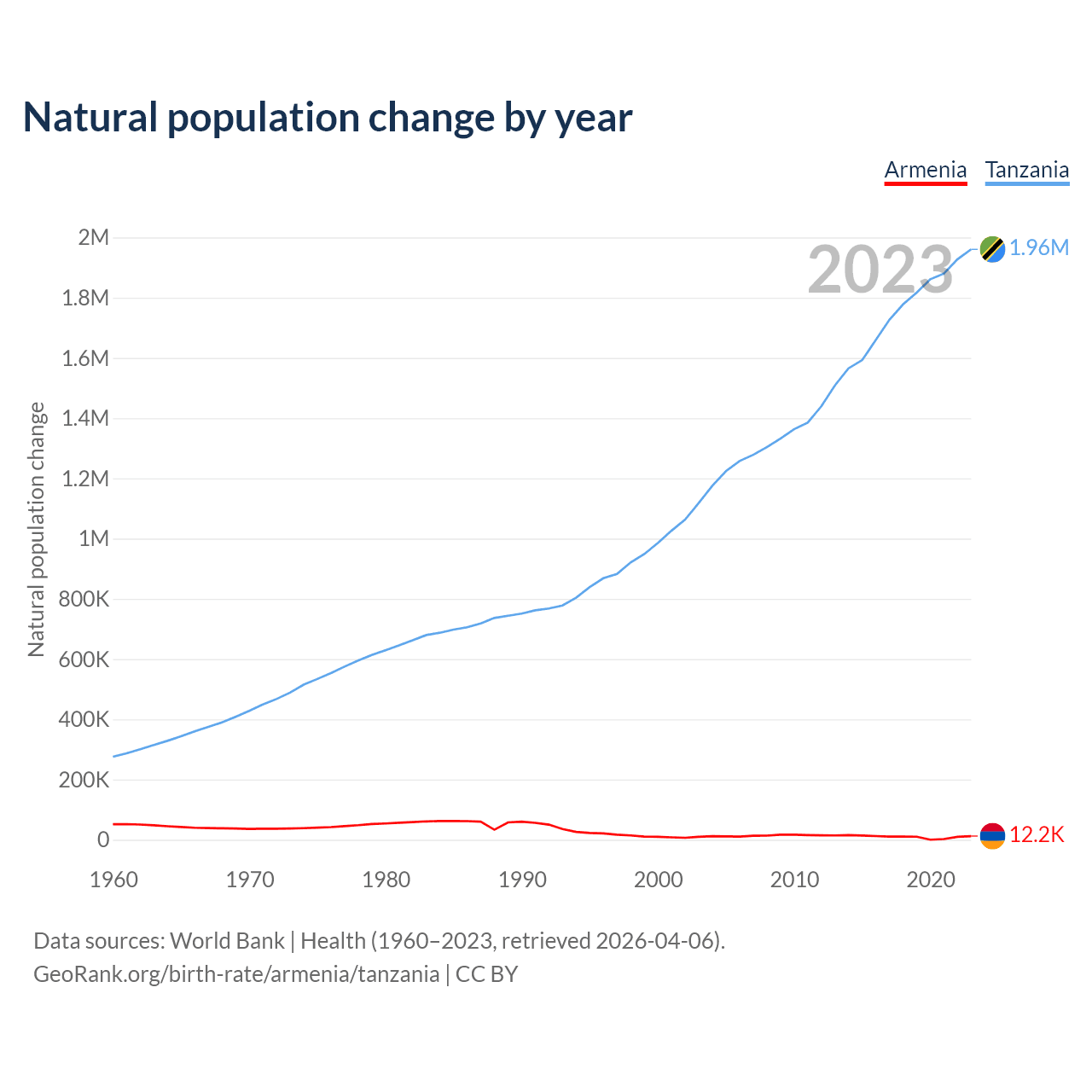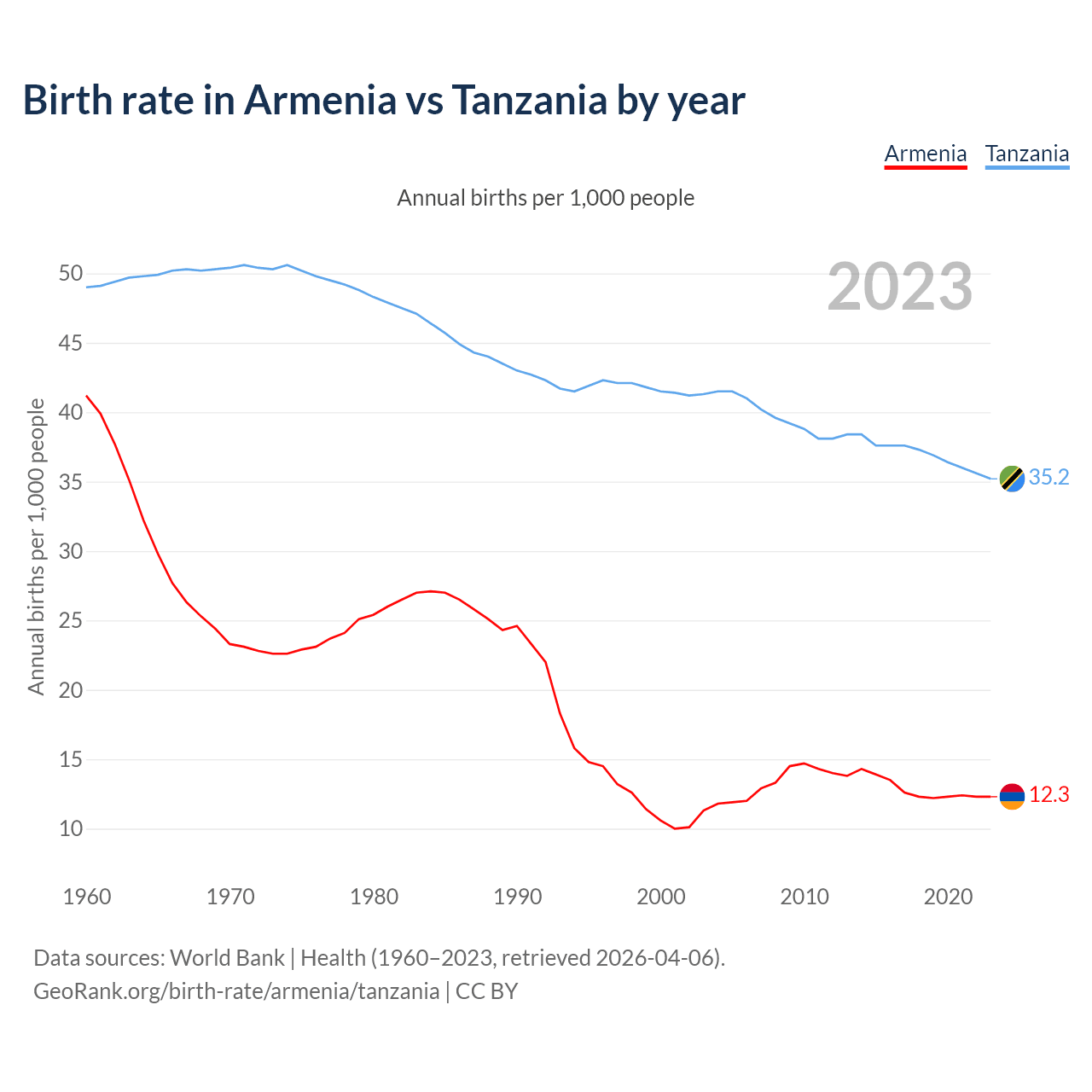 Armenia has an annual birth rate of 12.3 births per 1,000 people, compared to 35.2 for Tanzania. The average number of children a woman is expected to have during her lifetime — the fertility rate, is 1.9 in Armenia and 4.61 in Tanzania — 142.4% difference.