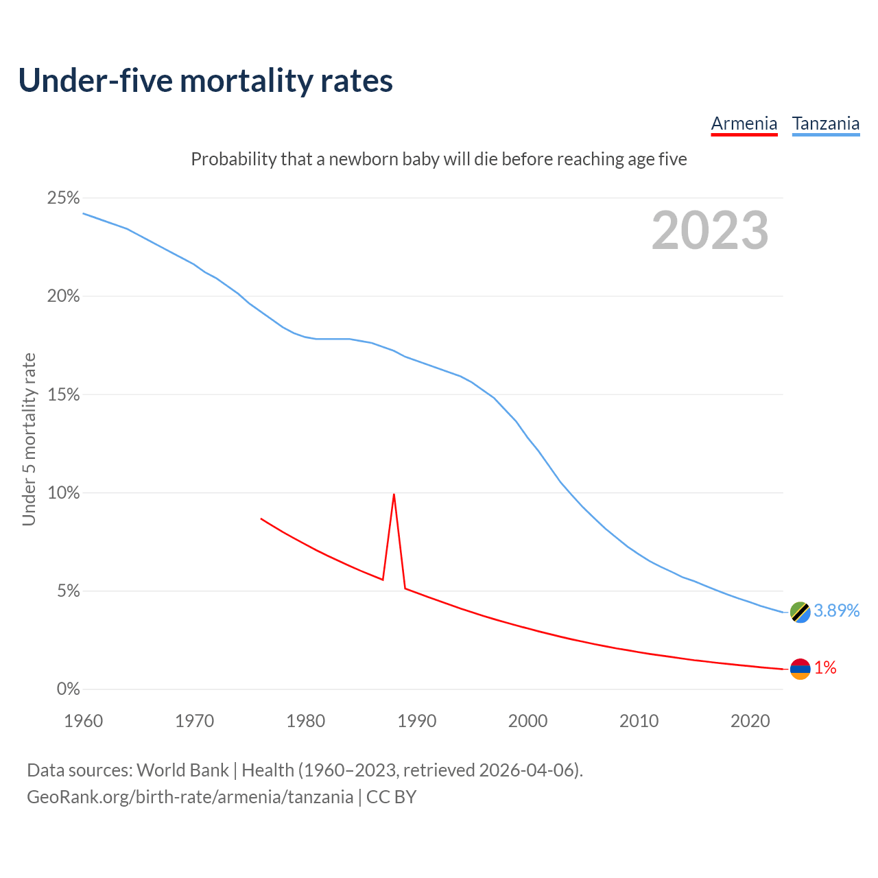The chance that a newborn baby will die before reaching age five is 1% in Armenia and 3.89% in Tanzania. Above is a chart with historical data on under-five mortality rates.