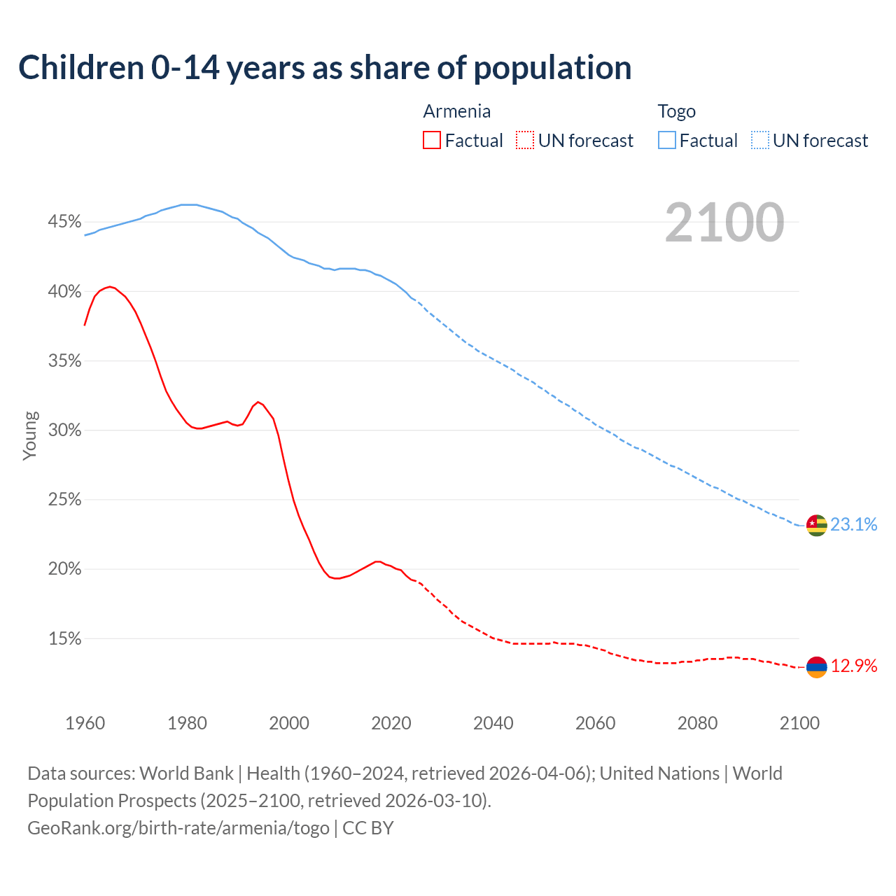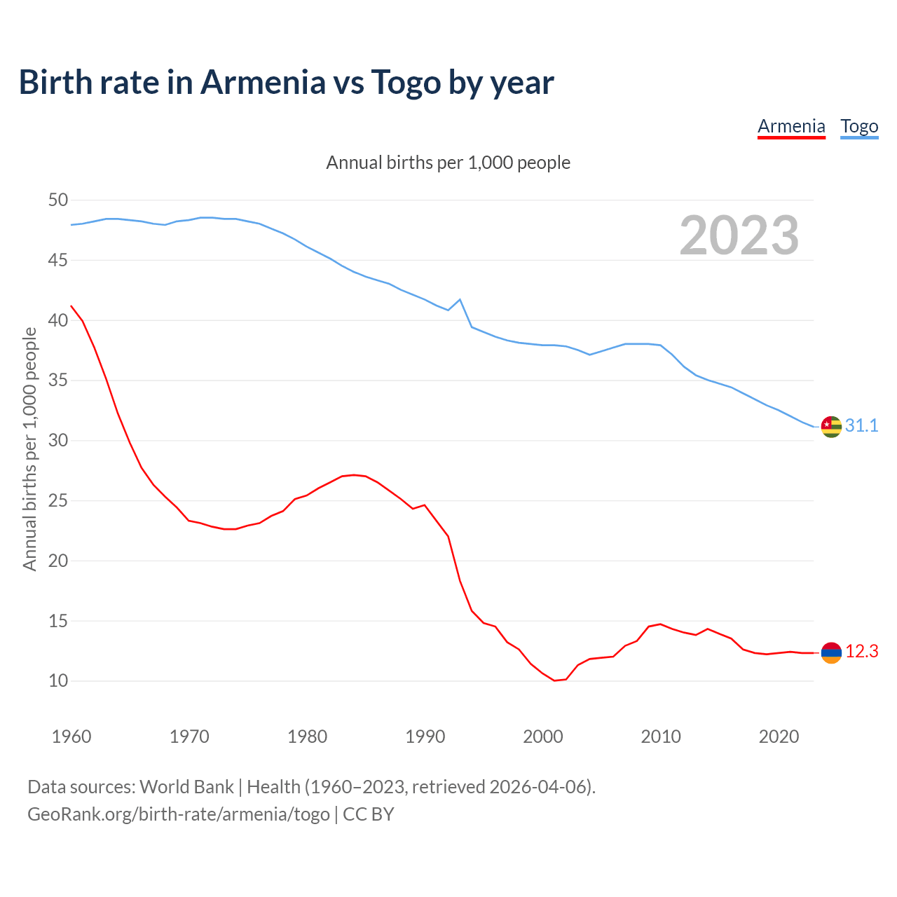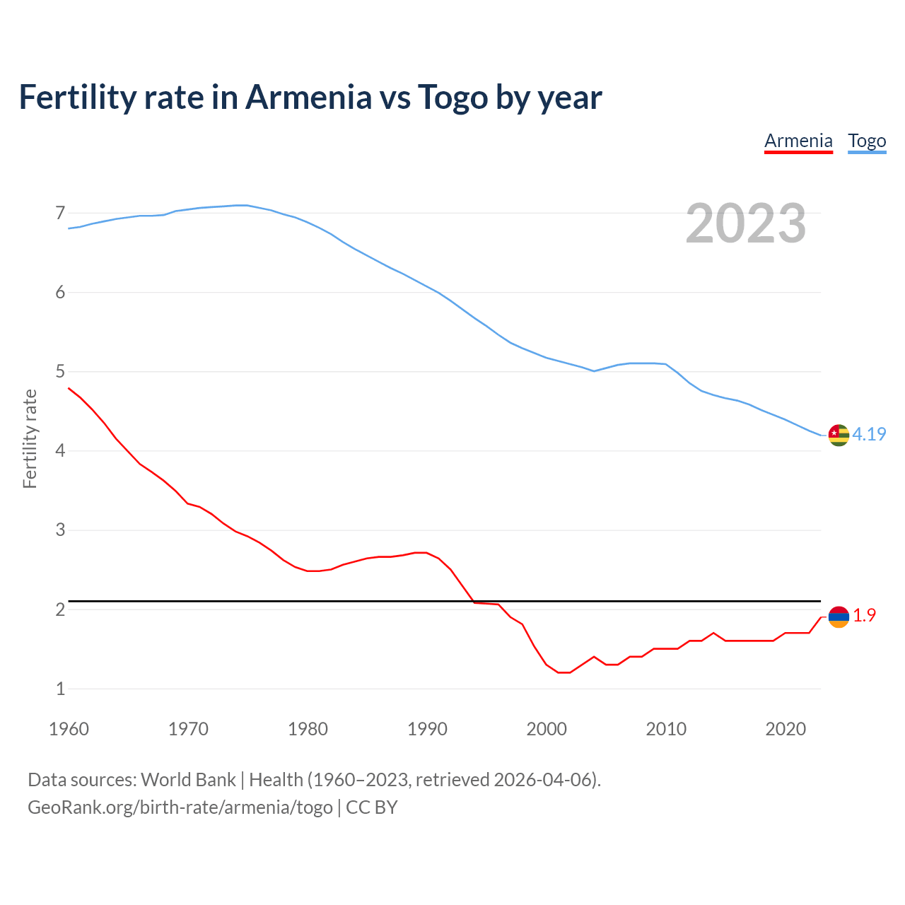According to the latest available data on birth rates, the fertility rate in Armenia was 1.9 children per woman in 2023, compared to 4.19 in Togo in 2023. The replacement level is considered to be 2.1 children per woman.