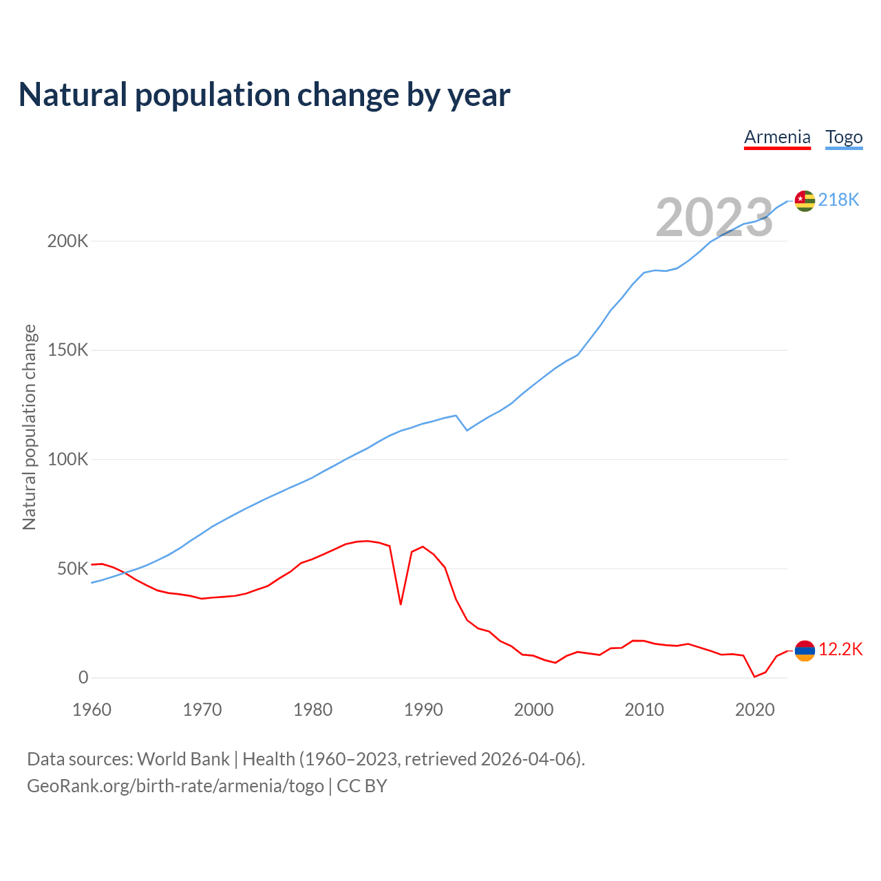 Armenia has an annual birth rate of 12.3 births per 1,000 people, compared to 31.1 for Togo. The average number of children a woman is expected to have during her lifetime — the fertility rate, is 1.9 in Armenia and 4.19 in Togo — 120.6% difference.