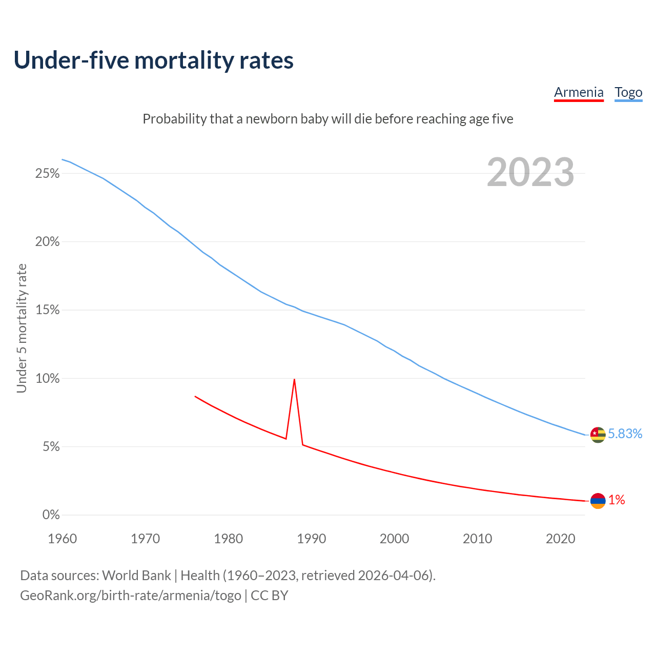 The chance that a newborn baby will die before reaching age five is 1% in Armenia and 5.83% in Togo. Above is a chart with historical data on under-five mortality rates.