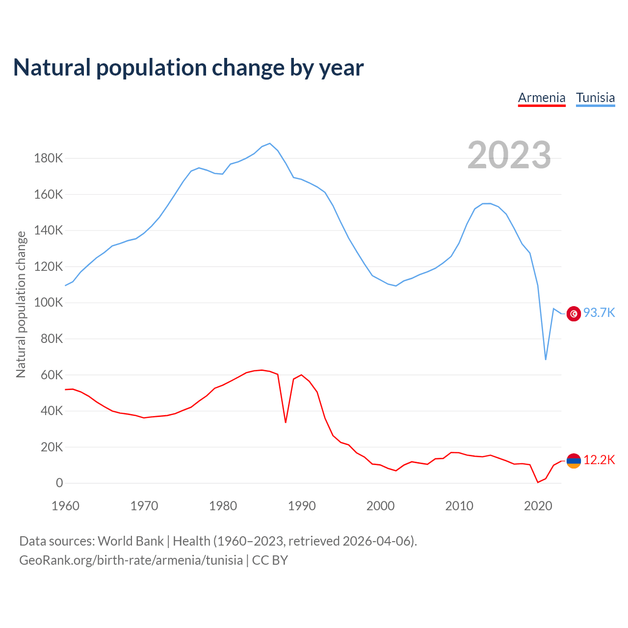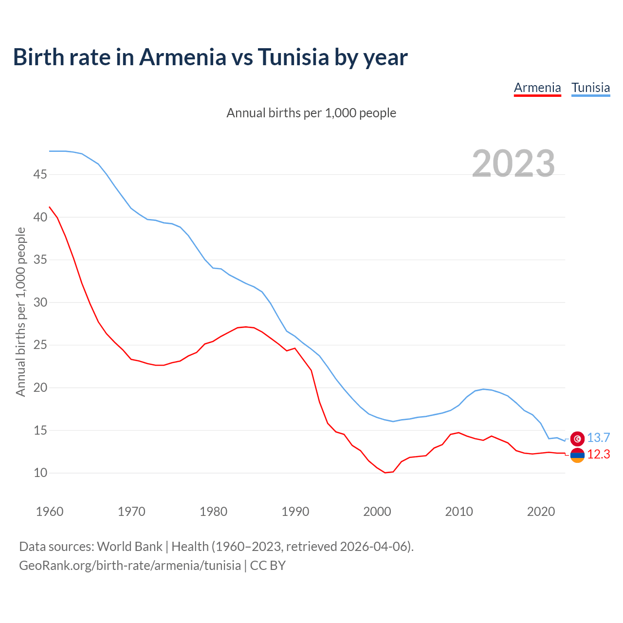 Armenia has an annual birth rate of 12.3 births per 1,000 people, compared to 13.7 for Tunisia. The average number of children a woman is expected to have during her lifetime — the fertility rate, is 1.9 in Armenia and 1.83 in Tunisia — 3.58% difference.