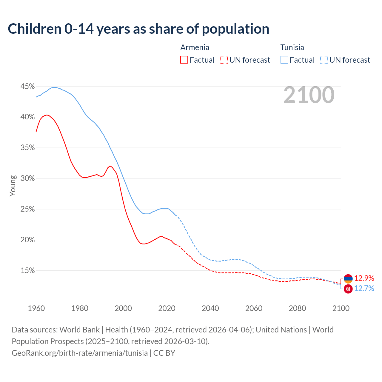 According to the latest available data on birth rates, the fertility rate in Armenia was 1.9 children per woman in 2023, compared to 1.83 in Tunisia in 2023. The replacement level is considered to be 2.1 children per woman.