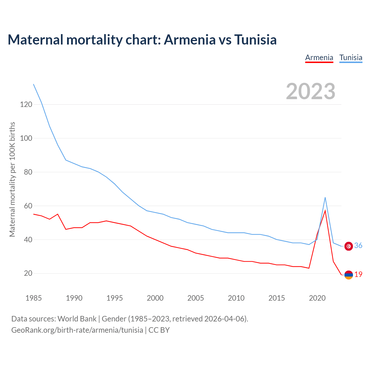 The maternal mortality rate, which is the probability of dying during childbirth or within 42 days of pregnancy termination, is 19 deaths per 100,000 live births in Armenia, compared to 36 deaths in Tunisia.