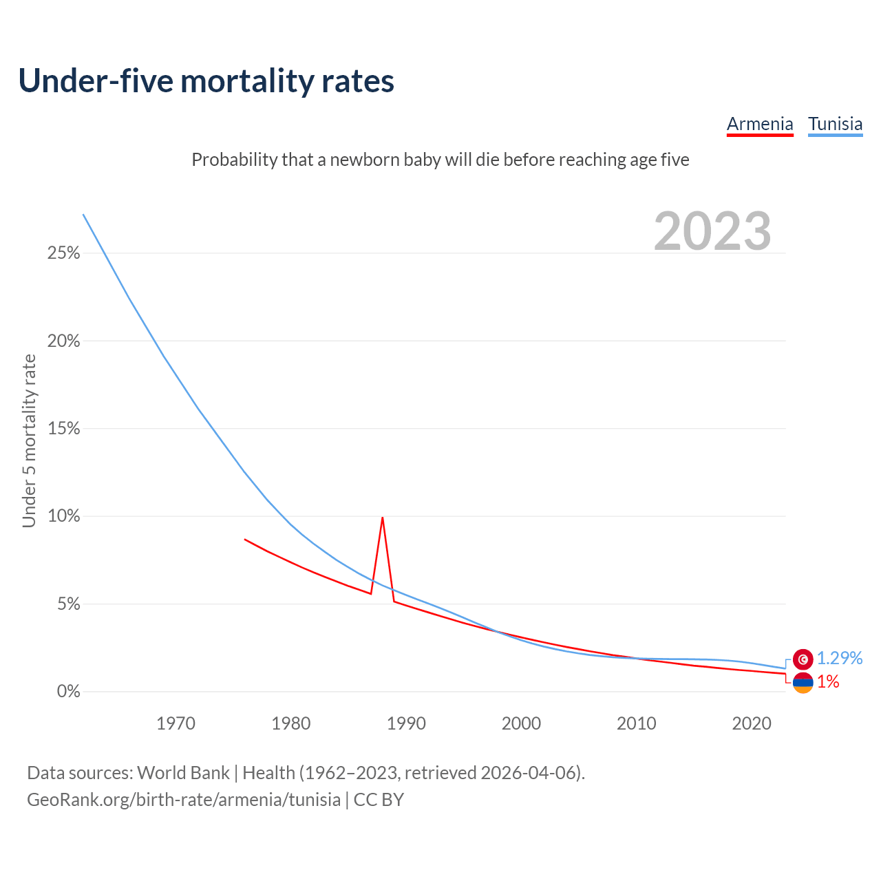 The chance that a newborn baby will die before reaching age five is 1% in Armenia and 1.29% in Tunisia. Above is a chart with historical data on under-five mortality rates.